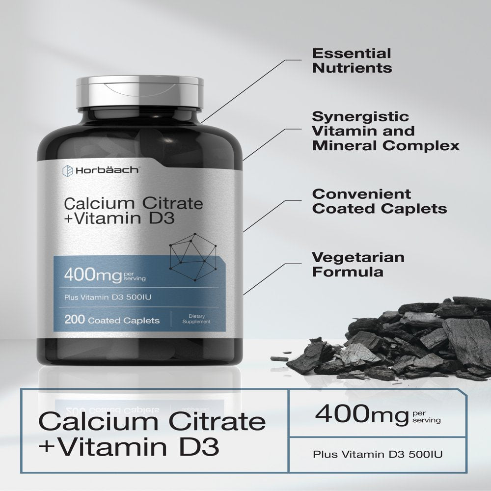 Calcium Citrate & Vitamin D3 | 200 Caplets | Vegetarian Formula | by Horbaach