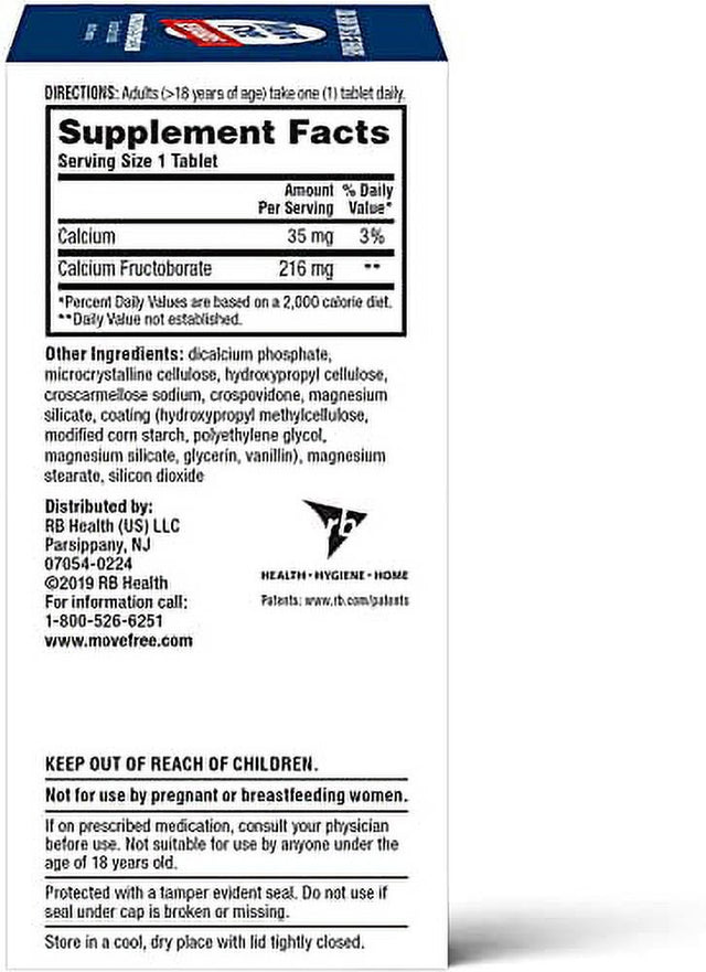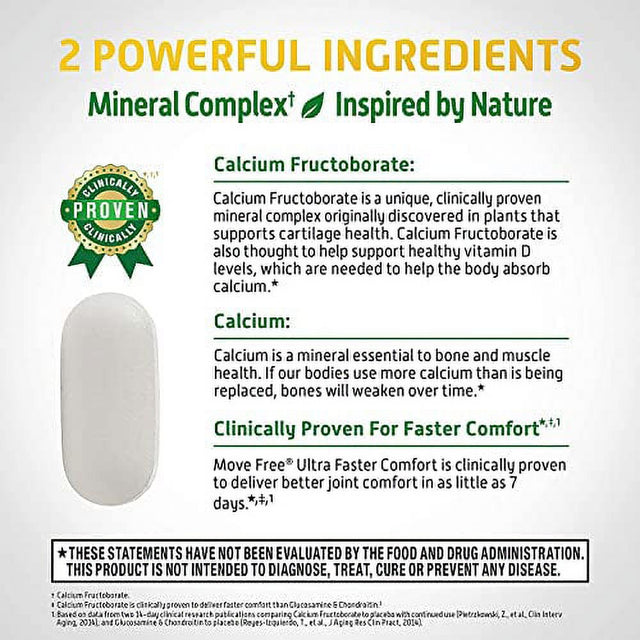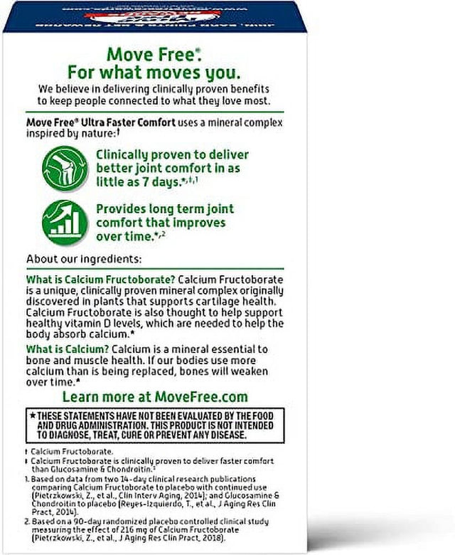 Did you know Move Free Ultra Faster Comfort is clinically proven to deliver better joint comfort in as little as 7 days?*? Get the joint support you want in just 1 tiny pill per day! This unique formula uses a mineral complex inspired by nature which provides long term joint comfort that improves over time.*? WHY MOVE FREE: Our scientists started in the fitness community, helping athletes who have experienced joint discomfort. Then it became obvious it wasn?t just athletes who needed our help. Moms, dads, grandparents?all were looking for a way to support their joint health. Move Free products have one goal in mind: to keep you moving. WHY CALCIUM FRUCTOBORATE: Calcium Fructoborate is a unique, clinically proven mineral complex originally discovered in plants that supports cartilage health. Calcium Fructoborate is also thought to help support healthy Vitamin D levels, which are needed to help the body absorb calcium.* WHY CALCIUM: Calcium is a mineral essential to bone and muscle health. If our bodies use more calcium than is being replaced, bones will weaken over time.* Move Free & Move Forward! * THESE STATEMENTS HAVE NOT BEEN EVALUATED BY THE FOOD AND DRUG ADMINISTRATION. THIS PRODUCT IS NOT INTENDED TO DIAGNOSE, TREAT, CURE, OR PREVENT ANY DISEASE. Calcium Fructoborate Calcium Fructoborate is clinically proven to deliver faster comfort than Glucosamine & Chondroitin.? ?Based on data from two 14-day clinical research publications comparing Calcium Fructoborate to placebo with continued use; and Glucosamine & Chondroitin to placebo. ?Based on a 90-day randomized placebo controlled study measuring the effect of 216 mg of Calcium Fructoborate.