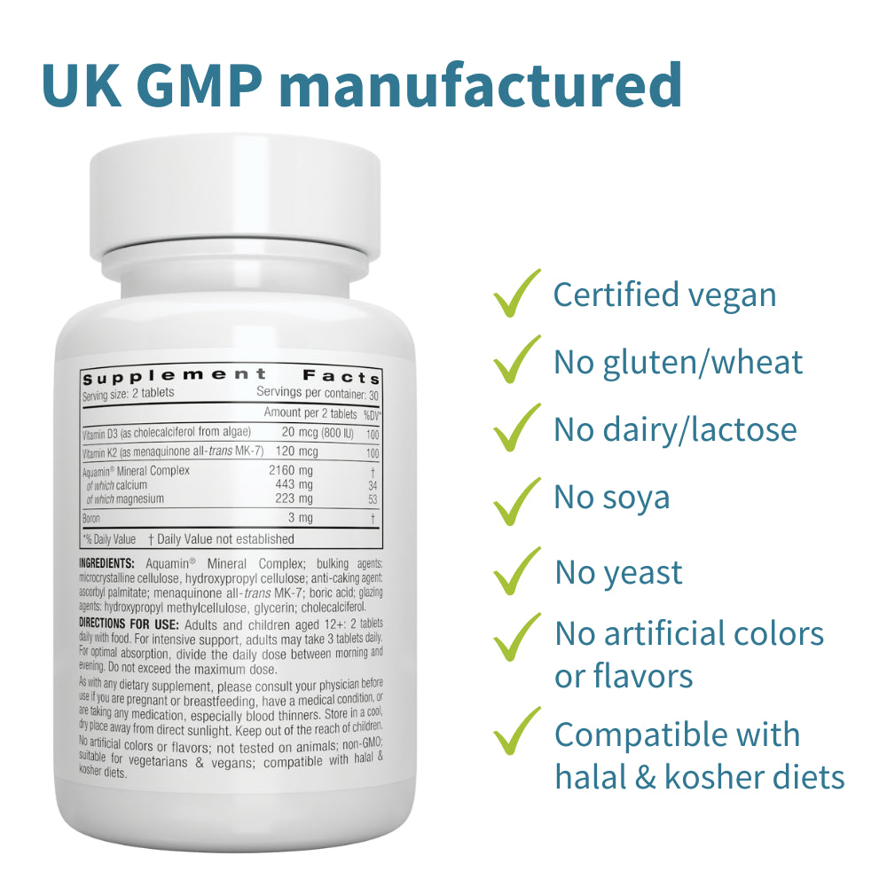 - SUPER ABSORBABLE PLANT-BASED NUTRIENT FORMS: raw algae calcium is 45% more soluble than calcium carbonate from rock. Magnesium from mineral-rich seawater offers superior absorption. Active D3 form. All-trans K2 MK-7. Optimal 3mg boron dose