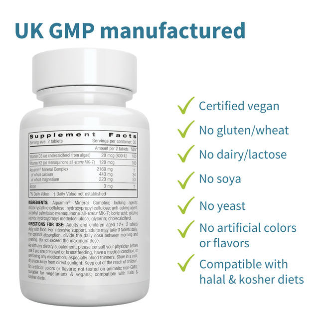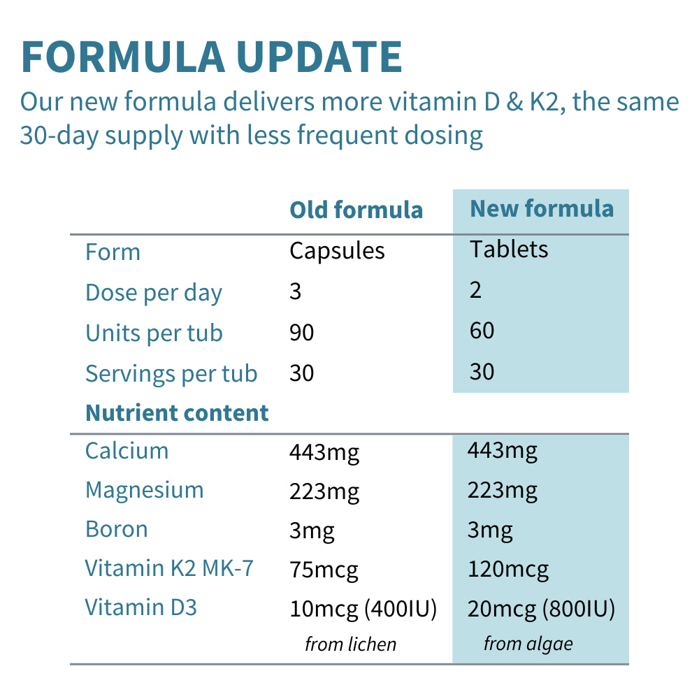 - FORMULA UPDATE: delivers the same amount of calcium & magnesium with a boosted dose of vitamins D & K2 in 2 tablets (previously 10mcg D3 & 75mcg K2 per 3 capsules), using only natural plant-derived excipients (no silicon dioxide or magnesium stearate)