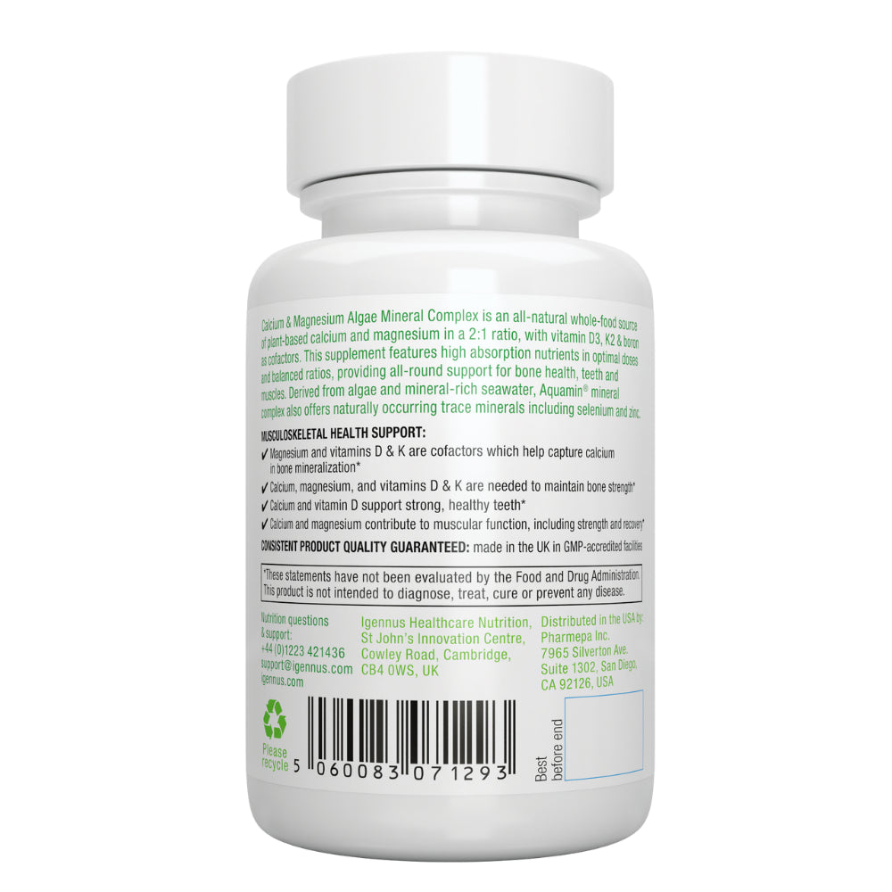 - 2:1 ALGAE CALCIUM & MAGNESIUM: Igennus nutrition scientists carefully formulated a 2:1 calcium to magnesium ratio at meaningful doses, essential for long-term musculoskeletal health. Split dosing boosts absorption