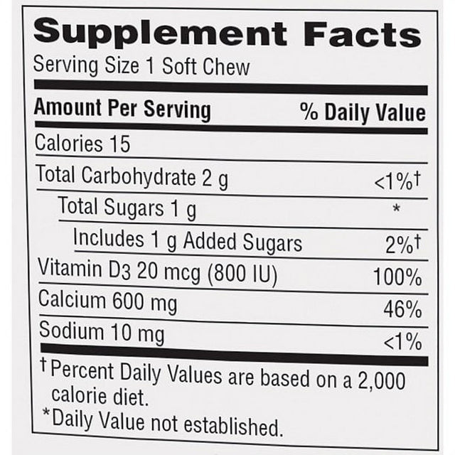 1200 mg of calcium and 800 IU of vitamin D3 in just two soft chews a day. 100% of the recommended daily amount of vitamin D to optimize calcium absorption and support breast health.