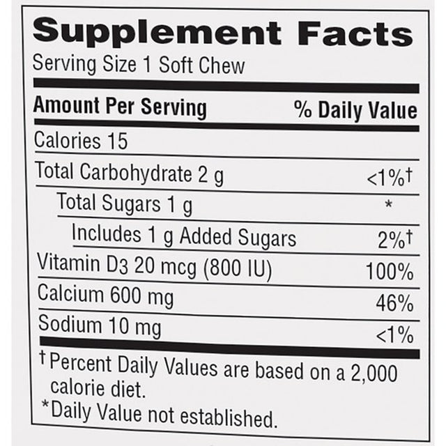 - Pack of 4 for the UPC: 300055568198 It's never too late.Calcium SupplementPfizerActive Ingredients:Per 1 Soft Chew: Calories 15; Total Carbohydrate 2 g (Sugars 1 g); Vitamin D3 400 IU; Calcium 600 mg; Sodium 10 mg; Calcium Carbonate; Corn Syrup; Sucrose; Hydrogenated Coconut Oil; Cocoa Processed with Alkali; Nonfat Dry Milk; Corn Syrup Solids; Glycerin; Contains <2% of: Cholecalciferol (Vit. D3); Corn Starch; Ethyl Alcohol; Invert Sugar; Lecithin (Soy); Medium-Chain Triglycerides; Modified Corn Starch; Natural and Artificial Flavors; Propylene Glycol; Salt; Silicon Dioxide; Sodium Ascorbate; Tocopherols; Tribasic Calcium Phosphate; Yellow Prussiate of Soda Do not exceed suggested use. Take one soft chew twice daily or as directed by your physician. Not formulated for use in children. Store at room temperature in a dry place. Reseal pouch after use.Uses:1200 mg of Calcium & 800 IU of Vitamin D in just 2 soft chews a day. Help keep your bones strong & your body moving.* Calcium plays an important role in:* bones, nerves, hormones, muscles, teeth, heart, colon. Vitamin D: Caltrate's advanced levels help:* optimize calcium absorption; support breast health (emerging science suggests Vitamin D helps support breast health. *These statements have not been evaluated by the Food and Drug Administration. This product is not intended to diagnose, treat, cure or prevent any disease. Contains: Milk, Soybean. Keep out of reach of children. As with any supplement, if you are pregnant, nursing, or taking medication, consult your doctor before use.