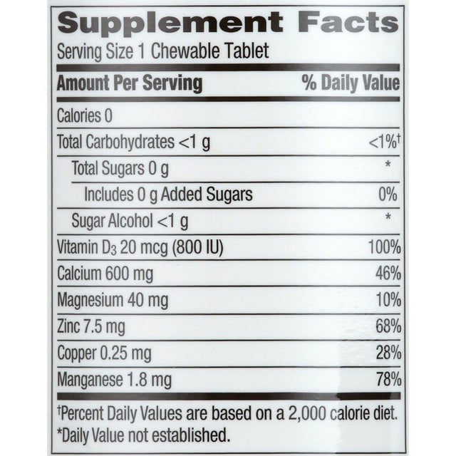 Caltrate Chewables 600+D3 Plus Minerals Calcium and Vitamin D Supplement contain a dual action formula of calcium with vitamin D for bone strength, plus collagen-supporting minerals (3) to help your bones stay flexible. (2) Each tablet contains 600 mg of calcium carbonate, a concentrated form of calcium, to support healthy bones and muscles. (2) In addition to calcium, each bone supplement tablet contains key essential minerals like zinc, copper and manganese to help support collagen production to facilitate more resilient bones that help keep you moving and doing the things you enjoy. (2) With 20 mcg of Vitamin D3 per tablet, Caltrate Plus Minerals supplement has the most vitamin D3 to help maximize calcium absorption to support stronger, healthier bones. (1, 2)