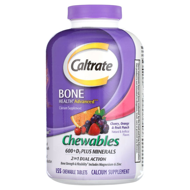 - 155 count bottle of Caltrate Chewables 600+D3 Plus Minerals Calcium Vitamin D Supplement in cherry, orange and fruit punch flavors