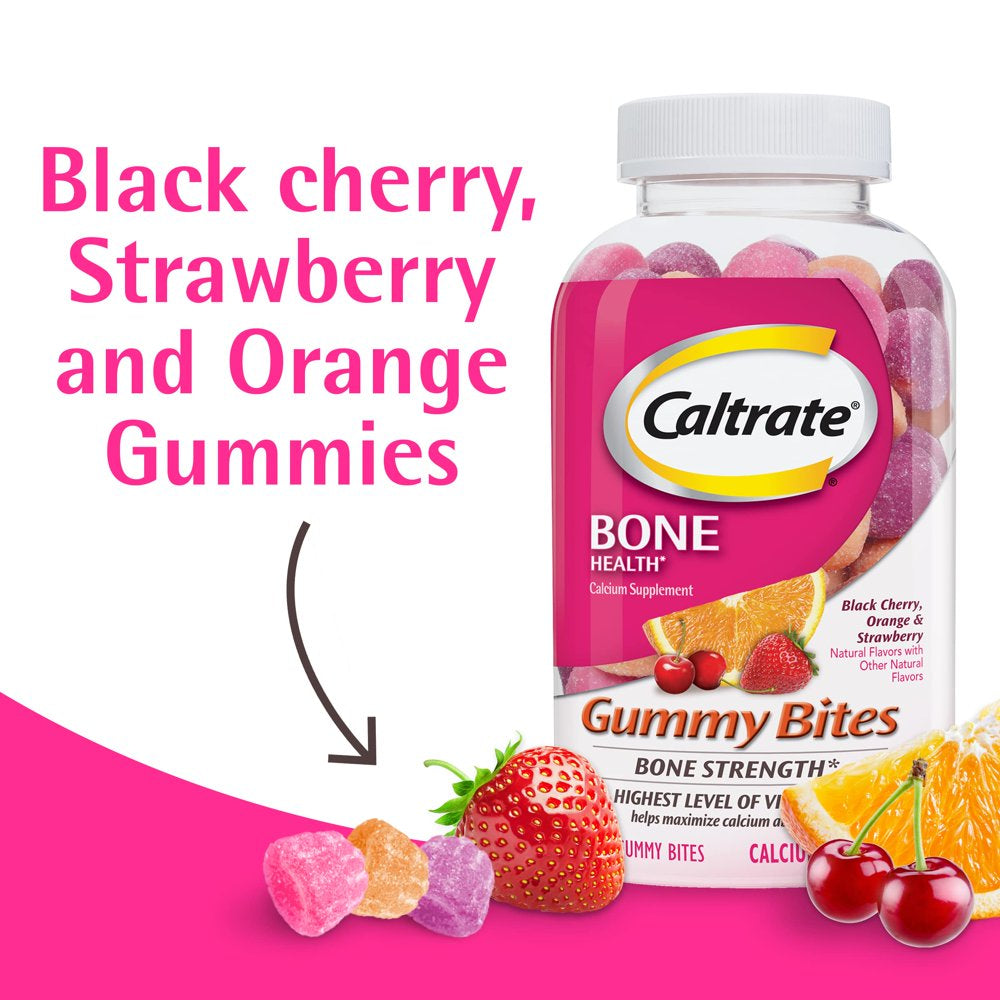 Caltrate Gummy Bites are a delicious way to get the calcium and vitamin D that healthy bones need (1, 2). Just two calcium and vitamin D supplement gummies contain 500 mg of calcium to support healthy bones and muscles. (1, 2) With 20 mcg of Vitamin D3 per serving, Caltrate Gummy Bites bone supplements contain the highest level of vitamin D3 to help maximize calcium absorption to support stronger, healthier bones. (1, 2) These chewable gummies come in great-tasting black cherry, strawberry and orange flavors, making them tasty and convenient bone support supplements for taking on the go. Simply take two of these bone supplement gummies up to two times daily with or without food to get the calcium and vitamin D your body needs to support healthy bones and muscles and keep you moving. (1) In addition to Caltrate Gummy Bites, Caltrate supplements are also available in soft chews, mini tablets, original tablets and chewables. (1) These statements have not been evaluated by the Food and Drug Administration. These products are not intended to diagnose, treat, cure or prevent any disease. (2) Per piece; among leading supplement brands