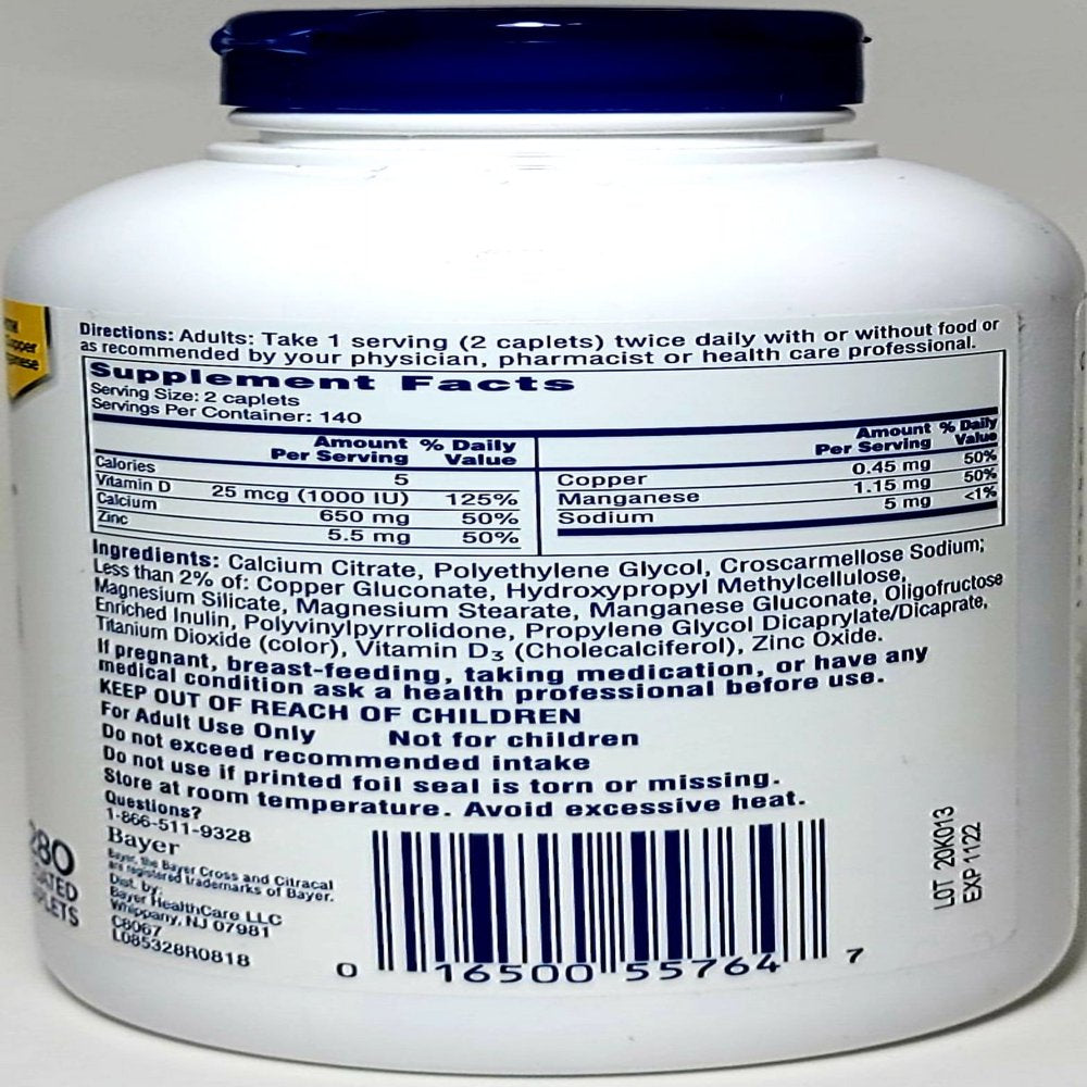 Citracal Calcium Citrate Caplets + D3 (280 ct.)Key Features-Take 1 serving (2 caplets) twice daily with or without food-Vitamin D: 1000 IU per serving, 125% Daily Value-Calcium: 630 mg per serving, 63% Daily ValueProduct Details:-#1 doctor-recommended calcium brand-Can be taken with or without food-Calcium citrate is easily absorbed by your body-Gentle on digestive system-Essential micronutrients to support bone health*-Contains zinc, copper and manganese-Easily absorbed-Gentle on your digestive system-Can be taken with or without food-For men and womenNew larger size—40 more caplets of Citracal Plus D #1 doctor-recommended calcium brand Can be taken with or without food Calcium citrate is easily absorbed by your body Gentle on digestive system.