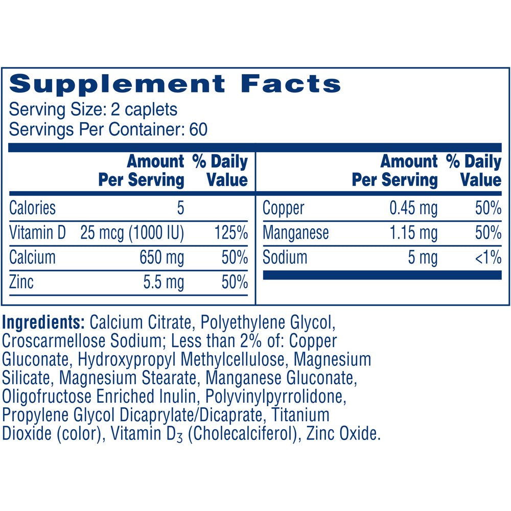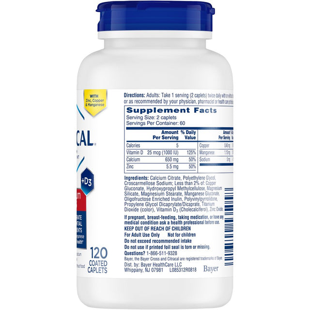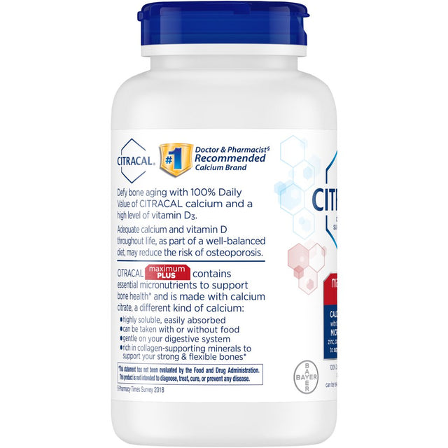 Citracal Maximum Plus sugar free coated Calcium Citrate caplets are designed to provide the calcium and vitamin D3 you may not get enough of from the foods you eat each day. Calcium is an essential mineral needed for bone health.* Add Citracal Maximum Plus as part of your daily regimen to support strong bones.* Vitamin D3 promotes calcium absorption. Citracal Maximum Plus contains a blend of 630 mg of Calcium Citrate, minerals such as zinc, copper and manganese and 1000 IU of vitamin D3 per serving to help achieve optimal bone health, defy bone aging and reduce the risk of Osteoporosis.†Easily absorbed and gentle on the stomach, Citracal Maximum Plus can be taken with or without food. Citracal is the #1 Doctor and Pharmacist‡ recommended calcium brand. So, whether you're 19 or 90, talk to your doctor about adding Citracal Maximum Plus to your diet and overall wellness and fitness regimen to help support bone health* †Adequate calcium and vitamin D throughout life, as part of a well-balanced diet, may reduce the risk of osteoporosis. ‡Pharmacy Times Survey, 2020. *This statement has not been evaluated by the Food and Drug Administration. This product is not intended to diagnose, treat, cure, or prevent any disease.