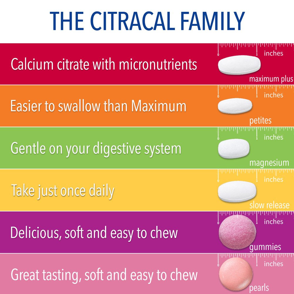 Citracal Maximum Plus sugar free coated Calcium Citrate caplets are designed to provide the calcium and vitamin D3 you may not get enough of from the foods you eat each day. Calcium is an essential mineral needed for bone health.* Add Citracal Maximum Plus as part of your daily regimen to support strong bones.* Vitamin D3 promotes calcium absorption. Citracal Maximum Plus contains a blend of 630 mg of Calcium Citrate, minerals such as zinc, copper and manganese and 1000 IU of vitamin D3 per serving to help achieve optimal bone health, defy bone aging and reduce the risk of Osteoporosis.† Easily absorbed and gentle on the stomach, Citracal Maximum Plus can be taken with or without food. Citracal is the #1 Doctor and Pharmacist‡ recommended calcium brand. So, whether you're 19 or 90, talk to your doctor about adding Citracal Maximum Plus to your diet and overall wellness and fitness regimen to help support bone health* †Adequate calcium and vitamin D throughout life, as part of a well-balanced diet, may reduce the risk of osteoporosis. ‡Pharmacy Times Survey, 2020. *This statement has not been evaluated by the Food and Drug Administration. This product is not intended to diagnose, treat, cure, or prevent any disease.