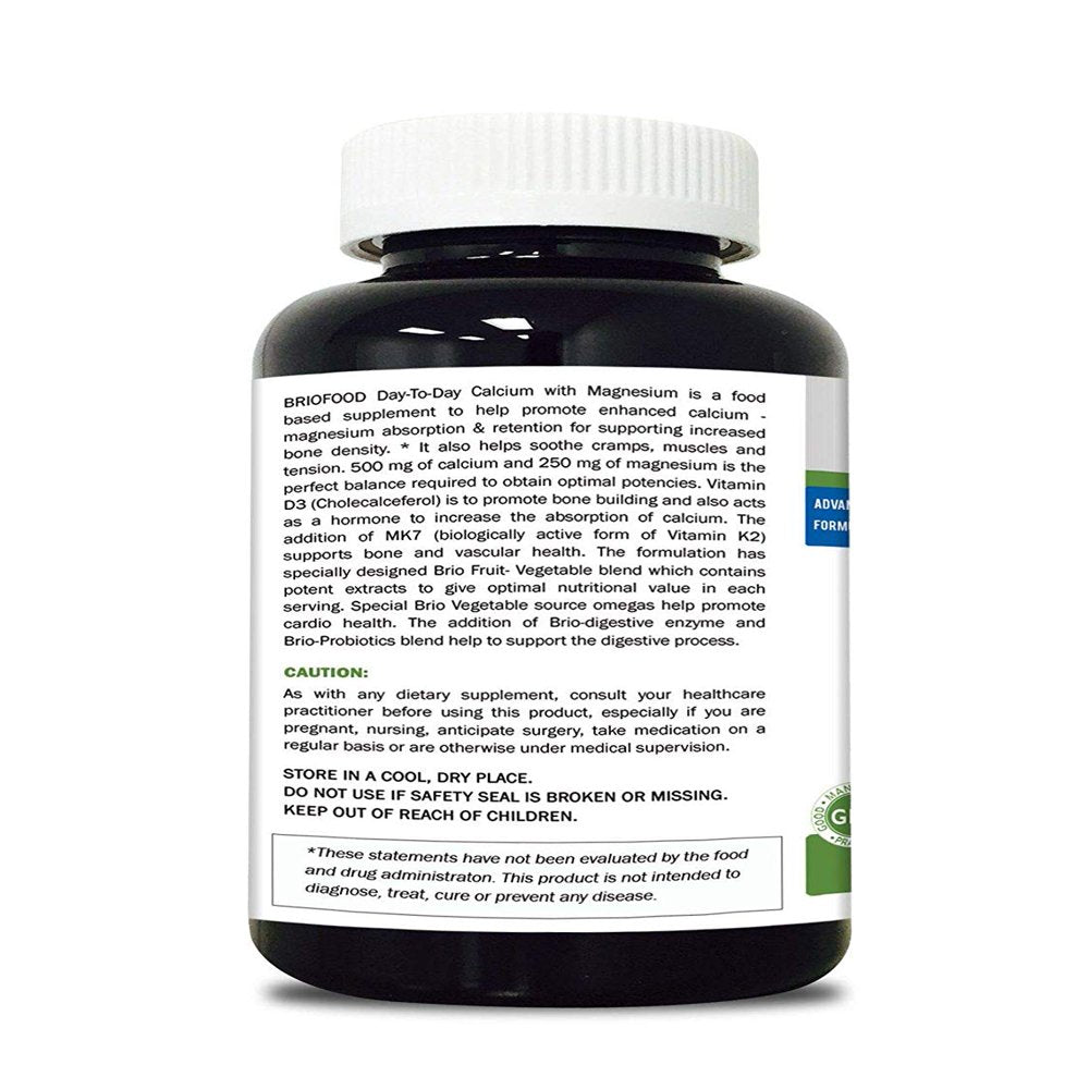 BRIEOFOOD Day-To-Day Calcium with Magnesium is a food based supplement to help promote enhanced calcium -magnesium absorption & retention for supporting increased bone density. * It also helps soothe cramps, muscles and tension. 500 mg of calcium and 250 mg of magnesium is the perfect balance required to obtain optimal potencies. Vitamin D3 (Cholecalceferol) is to promote bone building and also acts as a hormone to increase the absorption of calcium. The addition of MK7 (biologically active form of Vitamin K2) supports bone and vascular health. The formulation has specially designed Brieo Fruit- Vegetable blend which contains potent extracts to give optimal nutritional value in each serving. Special Brieo Vegetable source omegas help promote cardio health. The addition of Brieo-digestive enzyme and Brieo-Probiotics blend help to support the digestive process.