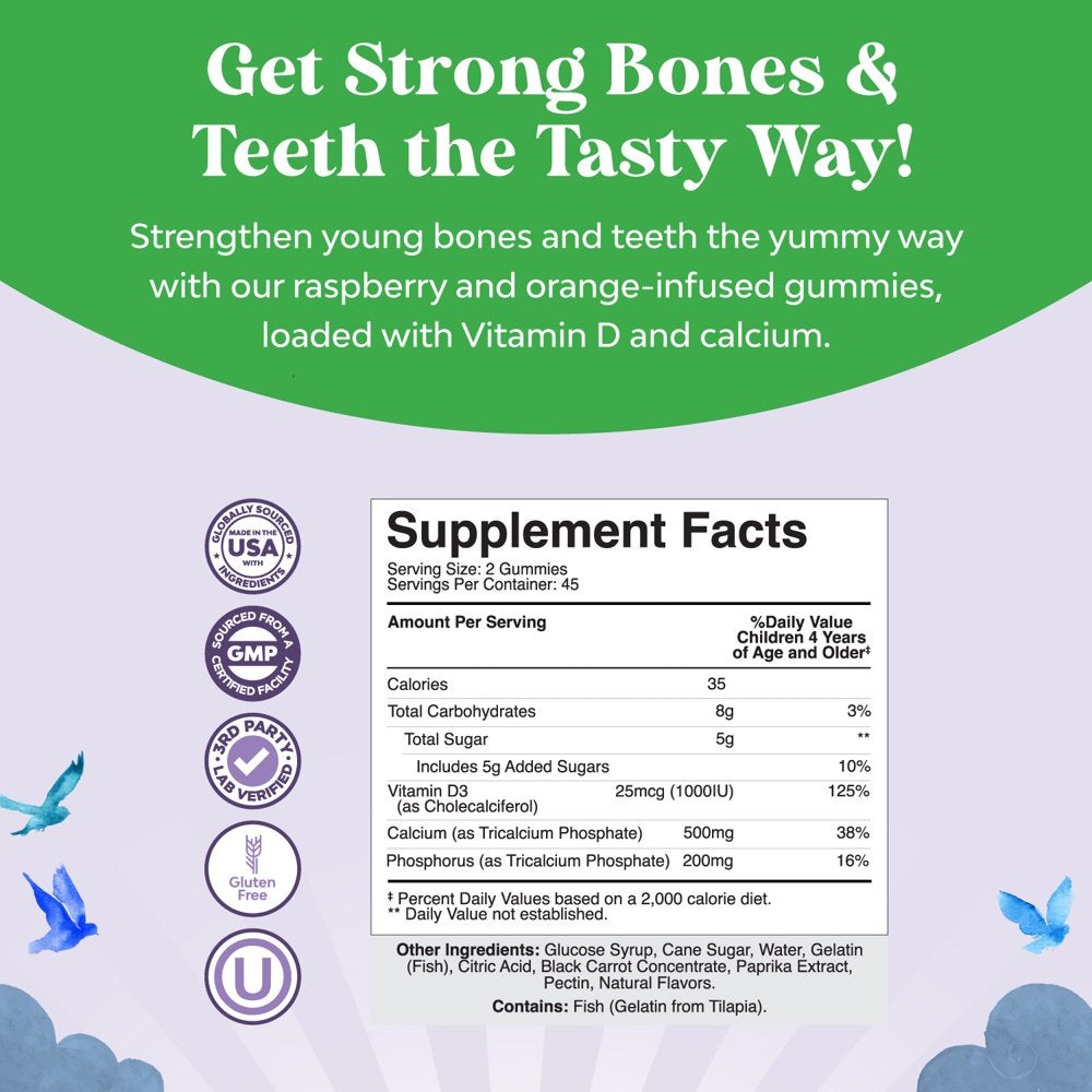 - Growth Boosting Gummies for Kids - All growing bodies need the right amount of calcium and vitamin D3 1000 IU to promote development and healthy bones teeth and muscles with our gluten-free gummies