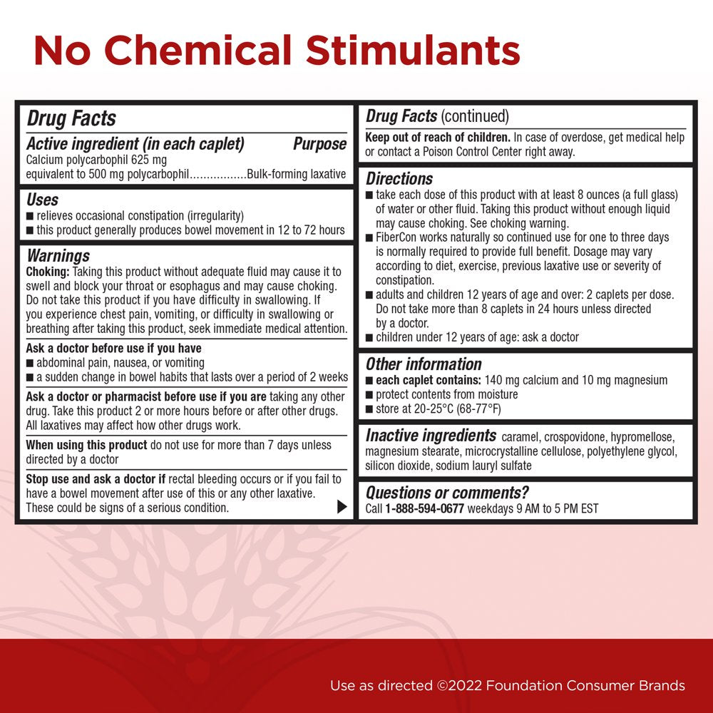Active Ingredients: (In each caplet) Calcium Polycarbophil 625 mg Equivalent to 500 mg Polycarbophil Bulk-Forming Laxative; Inactive Ingredients: Caramel, Crospovidone, Hypromellose, Magnesium Stearate, Microcrystalline Cellulose, Polyethylene Glycol, Silicon Dioxide, Sodium Lauryl Sulfate./div>