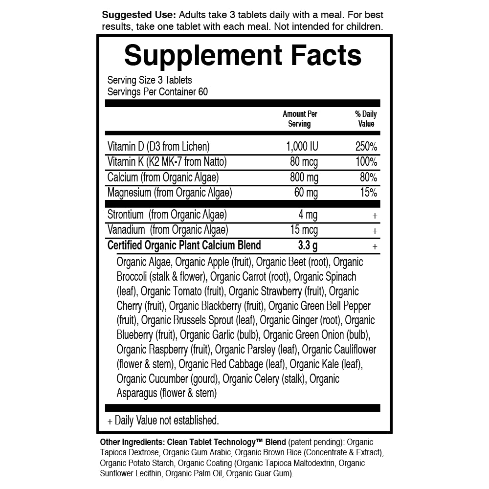 Certified Organic Plant Calcium Blend: Organic Algae, Organic Apple (Fruit), Organic Beet (Root), Organic Broccoli (Stalk & Flower), Organic Carrot (Root), Organic Spinach (Leaf), Organic Tomato (Fruit), Organic Strawberry (Fruit), Organic Cherry (Fruit), Organic Blackberry (Fruit), Organic Green Bell Pepper (Fruit), Organic Brussels Sprout (Leaf), Organic Ginger (Root), Organic Blueberry (Fruit), Organic Garlic (Bulb), Organic Green Onion (Bulb), Organic Raspberry (Fruit), Organic Parsley (Leaf), Organic Cauliflower (Flower & Stem), Organic Red Cabbage (Leaf), Organic Kale (Leaf), Organic Cucumber (Gourd), Organic Celery (Stalk), Organic Asparagus (Flower & Stem). Other Ingredients: Clean Tablet Technology Blend (Patent Pending): Organic Tapioca Dextrose, Organic Gum Arabic, Organic Brown Rice (Concentrate & Extract), Organic Potato Starch, Organic Coating (Organic Tapioca Maltodextrin, Organic Sunflower Lecithin, Organic Palm Oil, Organic Guar Gum)./div>