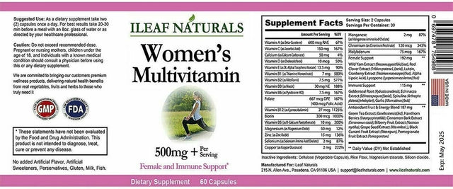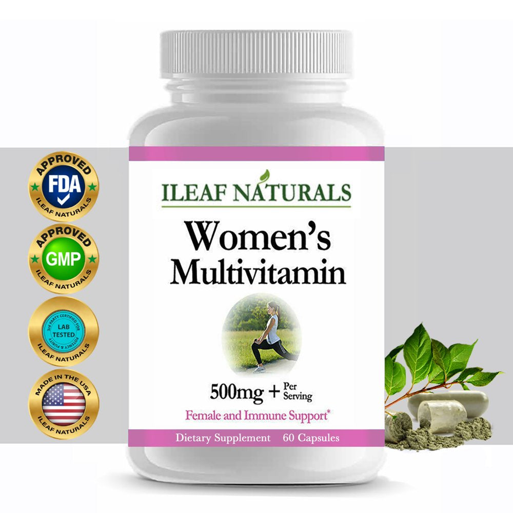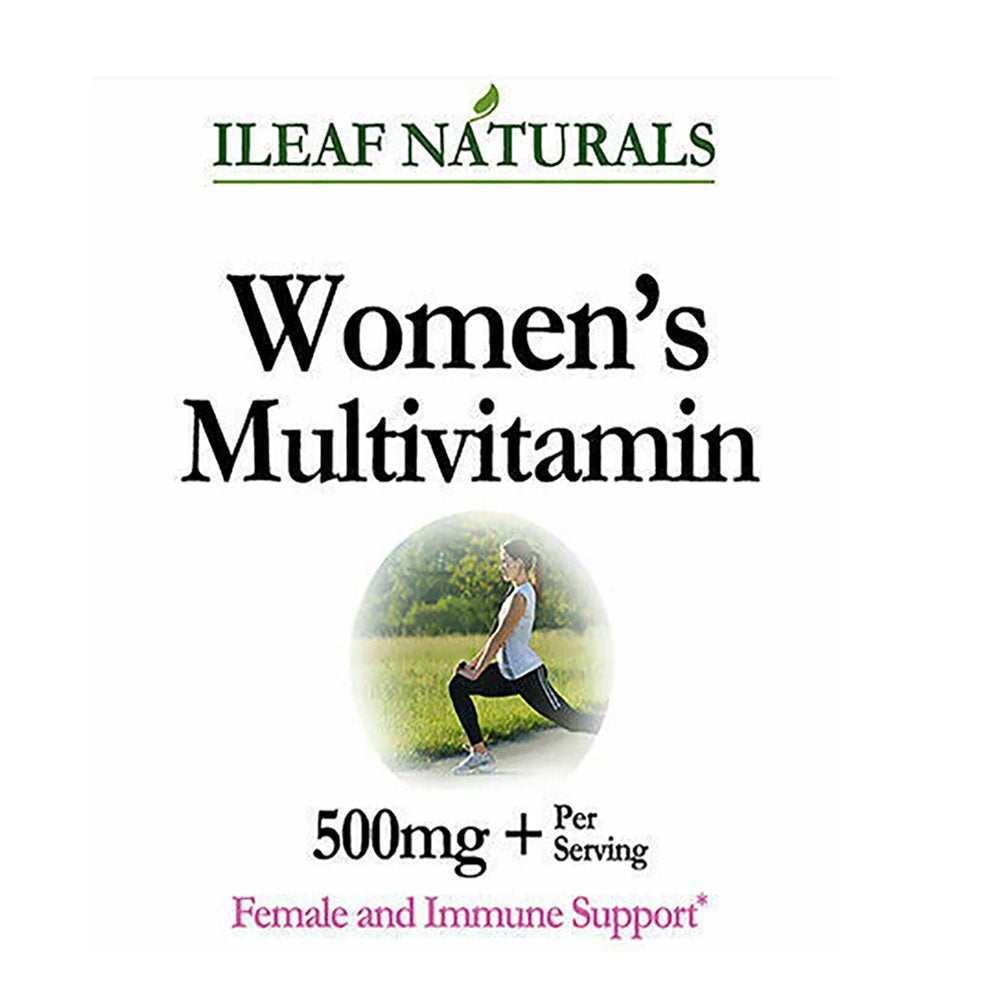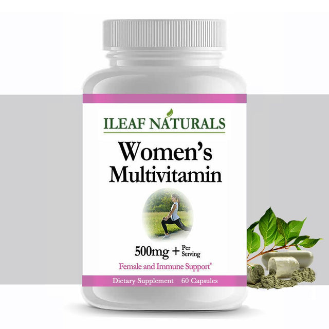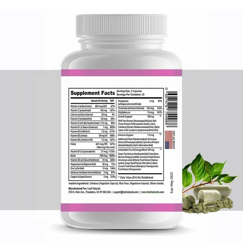 iLeaf Naturals Women's Multi-Vitamin with Calcium - 60 Veggie Capsules provides the right amount of vitamins, minerals, antioxidants, and herbs for the unique needs of women, making it a top-quality women's multivitamin. In today's recent fast-paced world, many women do not get the daily recommended allowance of vitamins, minerals, and other nutrients. iLeaf Naturals helps to bridge that nutrient gap by offering a women's multivitamin that includes necessary vitamins and minerals plus additional proprietary blends. Our Women's Multivitamin provides a balanced blend of antioxidants, herbs, vitamins, and minerals that have been specially formulated to support women's lifestyle and well-being. For example, the vitamin-B complex blend provides increased energy and helps provide mental clarity to the mind and body. Produced in easy to swallow capsules.