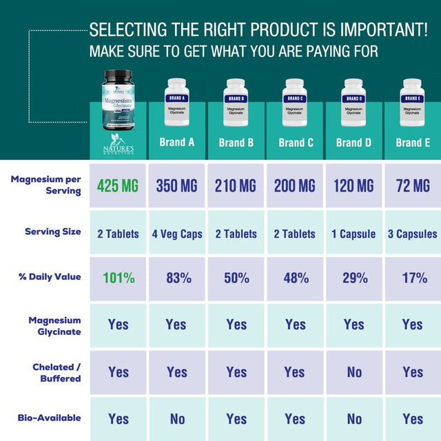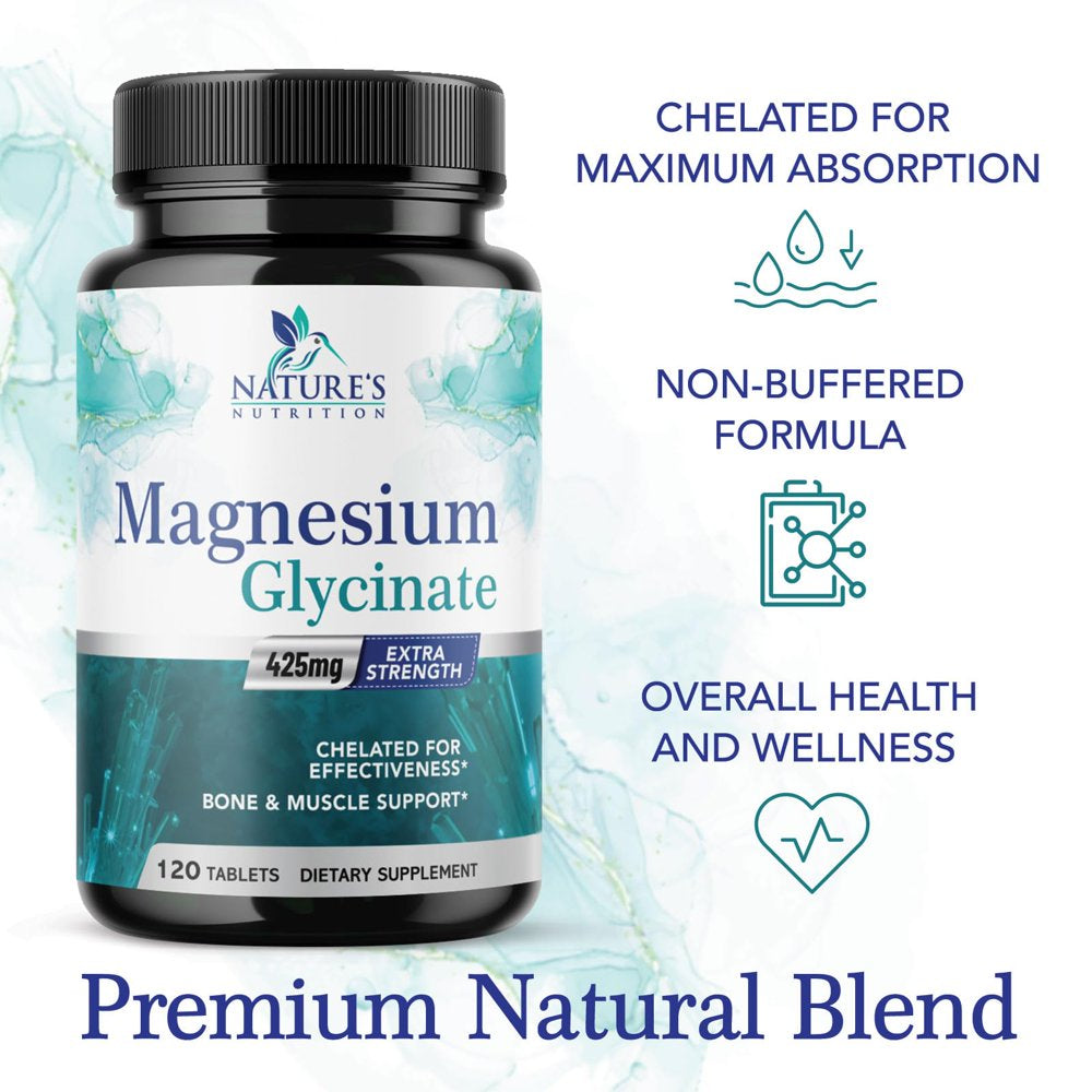 Nature's Nutrition Magnesium Glycinate (bisglycinate) is the best way to get your daily magnesium. We all need magnesium. It's essential in the everyday operation of our cells, nerves, muscles, bones, and heart, AND it's hard to get from most of the things we eat. Our bodies need magnesium for over 300 biochemical reactions. Our bodies cannot perform without magnesium. Our formula is optimally “chelated” with buffered glycinate to be highly bioavailable and to help your body absorb the magnesium faster and easier. Some of the essential roles of magnesium are: - Supports creation of ATP - Supports bone health Magnesium supports energy and also helps with minor muscle aches and muscle cramps. Nature's Nutrition's Magnesium Glycinate supplement is a grest way to get magnesium in addition to eating foods like Swiss chard, spinach, nuts, pumpkin and sesame seeds, seaweed, beans, lentils, and fish. Supplement Facts (Serving Size 2 Tablets): Magnesium (as Magnesium Glycinate) 425mg 101% Calcuim (as Calcium Carbonate) 189 mg 15% Inactive Ingredients: Stearic Acid, Polyethylene Glycol, Magnesium Stearate, Silicon Dioxide, Hpromellose, Titanium Dioxide. Each batch of our magnesium glycinate supplement is proudly formulated and bottled in the USA in a facility following strict cGMP guidelines. This product is also non-gmo, vegan friently, and third-party reviewed for purity and quality.