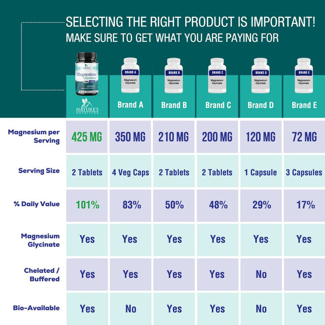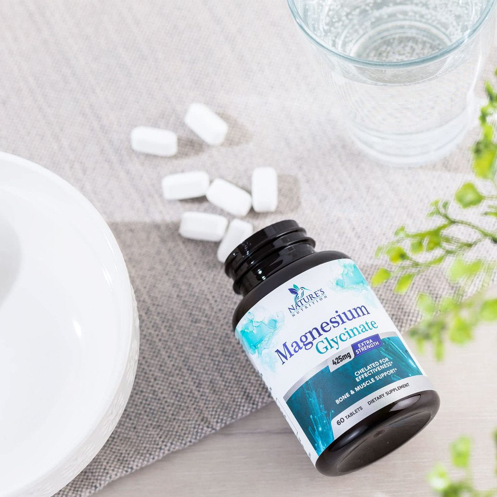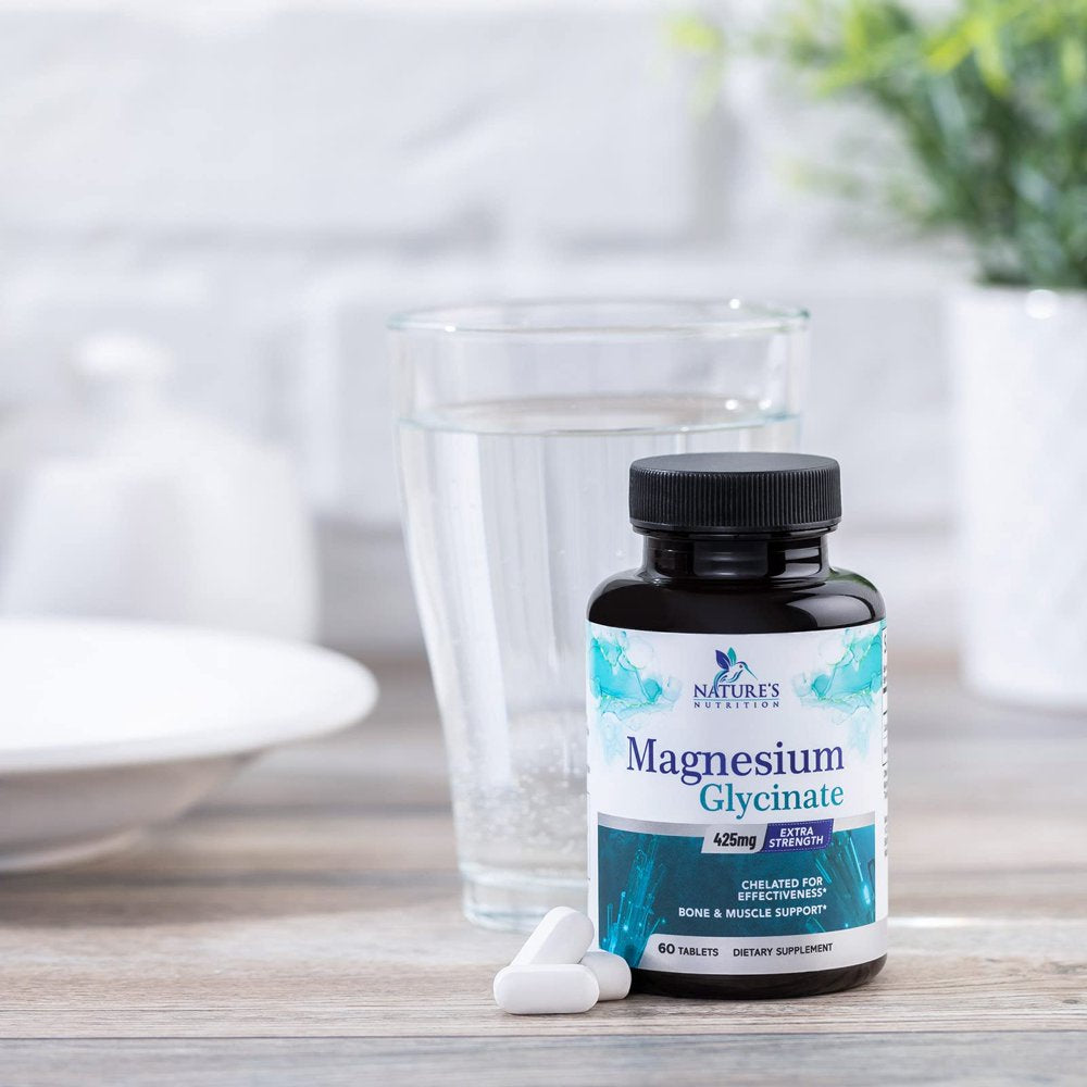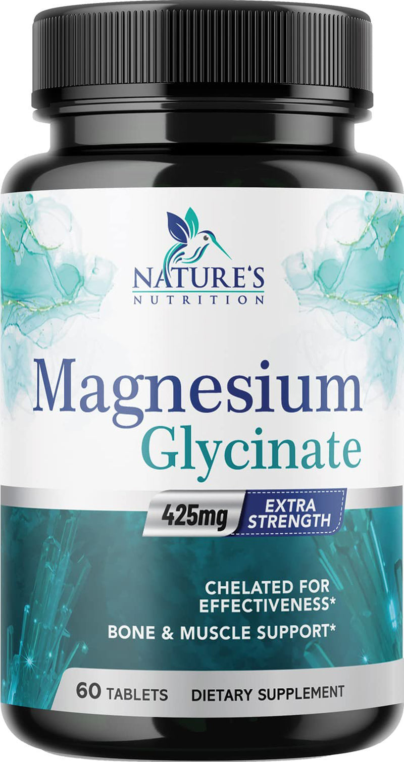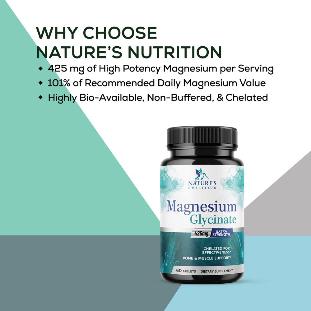 Nature's Nutrition Magnesium Glycinate (bisglycinate) is the best way to get your daily magnesium. We all need magnesium. It's essential in the everyday operation of our cells, nerves, muscles, bones, and heart, AND it's hard to get from most of the things we eat. Our bodies need magnesium for over 300 biochemical reactions. Our bodies cannot perform without magnesium. Our formula is optimally “chelated” with buffered glycinate to be highly bioavailable and to help your body absorb the magnesium faster and easier. Some of the essential roles of magnesium are: - Supports creation of ATP - Supports bone health Magnesium supports energy and also helps with minor muscle aches and muscle cramps. Nature's Nutrition's Magnesium Glycinate supplement is a grest way to get magnesium in addition to eating foods like Swiss chard, spinach, nuts, pumpkin and sesame seeds, seaweed, beans, lentils, and fish. Supplement Facts (Serving Size 2 Tablets): Magnesium (as Magnesium Glycinate) 425mg 101% Calcuim (as Calcium Carbonate) 189 mg 15% Inactive Ingredients: Stearic Acid, Polyethylene Glycol, Magnesium Stearate, Silicon Dioxide, Hpromellose, Titanium Dioxide. Each batch of our magnesium glycinate supplement is proudly formulated and bottled in the USA in a facility following strict cGMP guidelines. This product is also non-gmo, vegan friently, and third-party reviewed for purity and quality.
