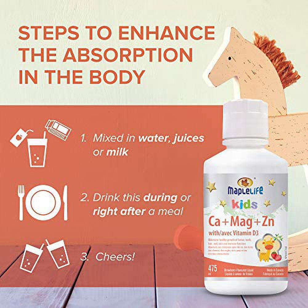 - DELICIOUS STRAWBERRY FLAVOURED LIQUID Our Ca-Mag-Zn + D liquid is flavoured with natural strawberry flavour - one of the most popular flavours among kids. You can either mix it with water, juices or milk, drink this during or after a meal. We know this will be the perfect complement, especially to a balanced diet!