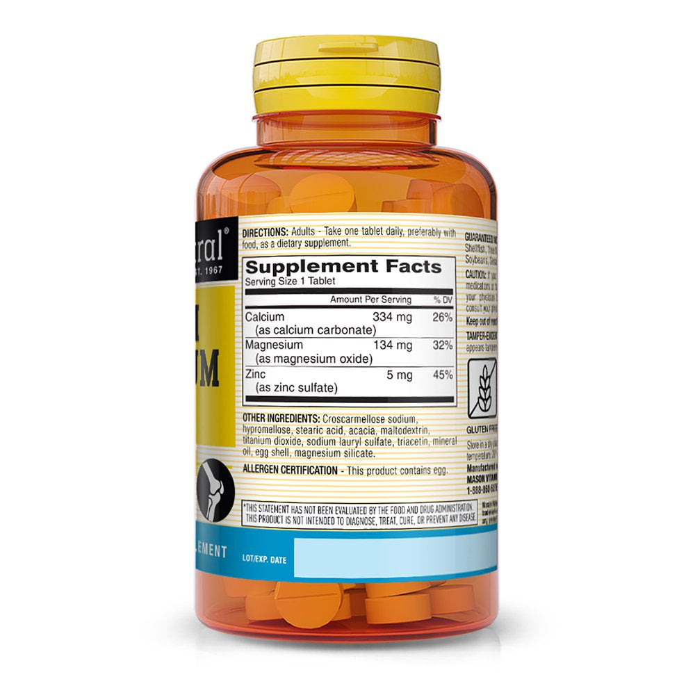 - Mason Natural Calcium Magnesium and Zinc once a day tablets deliver 334 mg of Calcium as calcium carbonate, 134 mg of Magnesium as magnesium oxide and 5 mg of Zinc as zinc sulfate to help support your natural bone health. They are an important part of your daily diet to help promotes bone growth, density and strength.