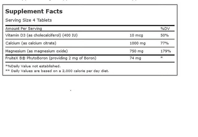 Nutrition Facts: Vitamin D3 (as cholecalciferol) 400 IU 100% 'Calcium (as calcium citrate) 1000 mg 100% 'Magnesium (as magnesium oxide) 750 mg 188% 'FruiteX B PhytoBoron (providing 2 mg of Boron) 74 mg *