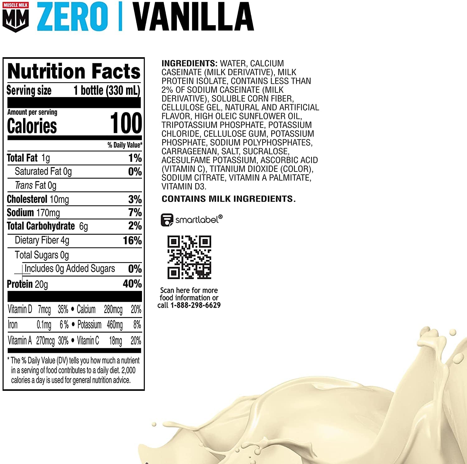 - Muscle Milk Zero Protein Shake, Vanilla Crème, 11.16 Fl Oz Bottle, 12 Pack, 20g Protein, Zero Sugar, 100 Calories, Calcium, Vitamins A, C & D, 4g Fiber, Energizing Snack, Workout Recovery, Packaging May Vary