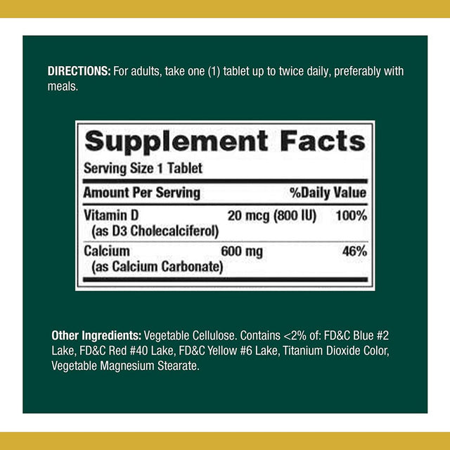 The company for all your vitamin and nutritional needs. Active Ingredients: 1 Tablet: Vitamin D3 (as Cholecalciferol) 400 IU; Calcium (as Calcium Carbonate) 600 mg; Vegetable Cellulose; Titanium Dioxide Color; Vegetable Magnesium Stearate; FD&C Yellow No. 6 Lake Uses: Calcium is the primary mineral responsible for strong bones and supports colon health.* The body also uses calcium for proper muscle contraction, nerve function and heart function.* Some scientific studies indicate that calcium may support healthy cell growth in the colon.* Vitamin D3 assists in maintaining a healthy immune system.* Just two tablets of Calcium 600 with Vitamin D3 give you the support of 120% of the Daily Value for calcium. No artificial flavor or sweetener, no preservatives, no sugar, no milk, no lactose, no soy, no gluten, no wheat, no yeast, no fish. Sodium free. *These statements have not been evaluated by the Food and Drug Administration. This product is not intended to diagnose, treat, cure or prevent any disease.