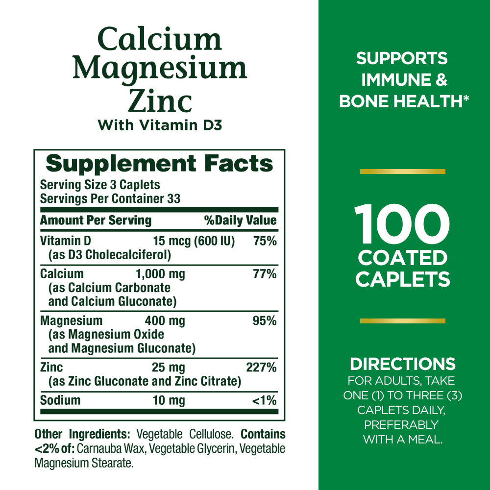 - Nature's Bounty Calcium, Magnesium, Zinc Coated Caplets for Bone Health, 100 Ct
