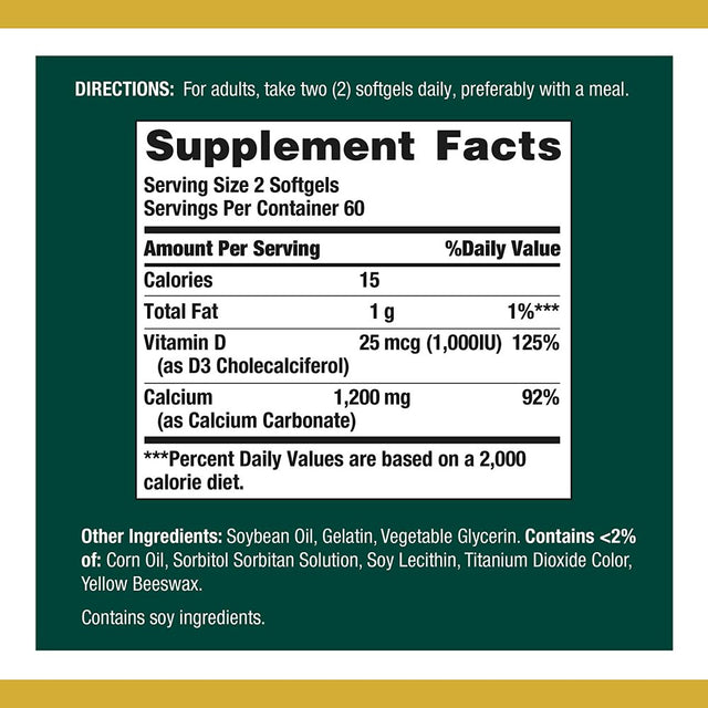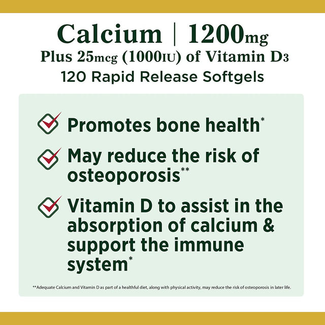 Nature's Bounty Calcium Plus Vitamin D3 1200 mg Rapid Release Softgels, 120 Ea, 3 Pack.