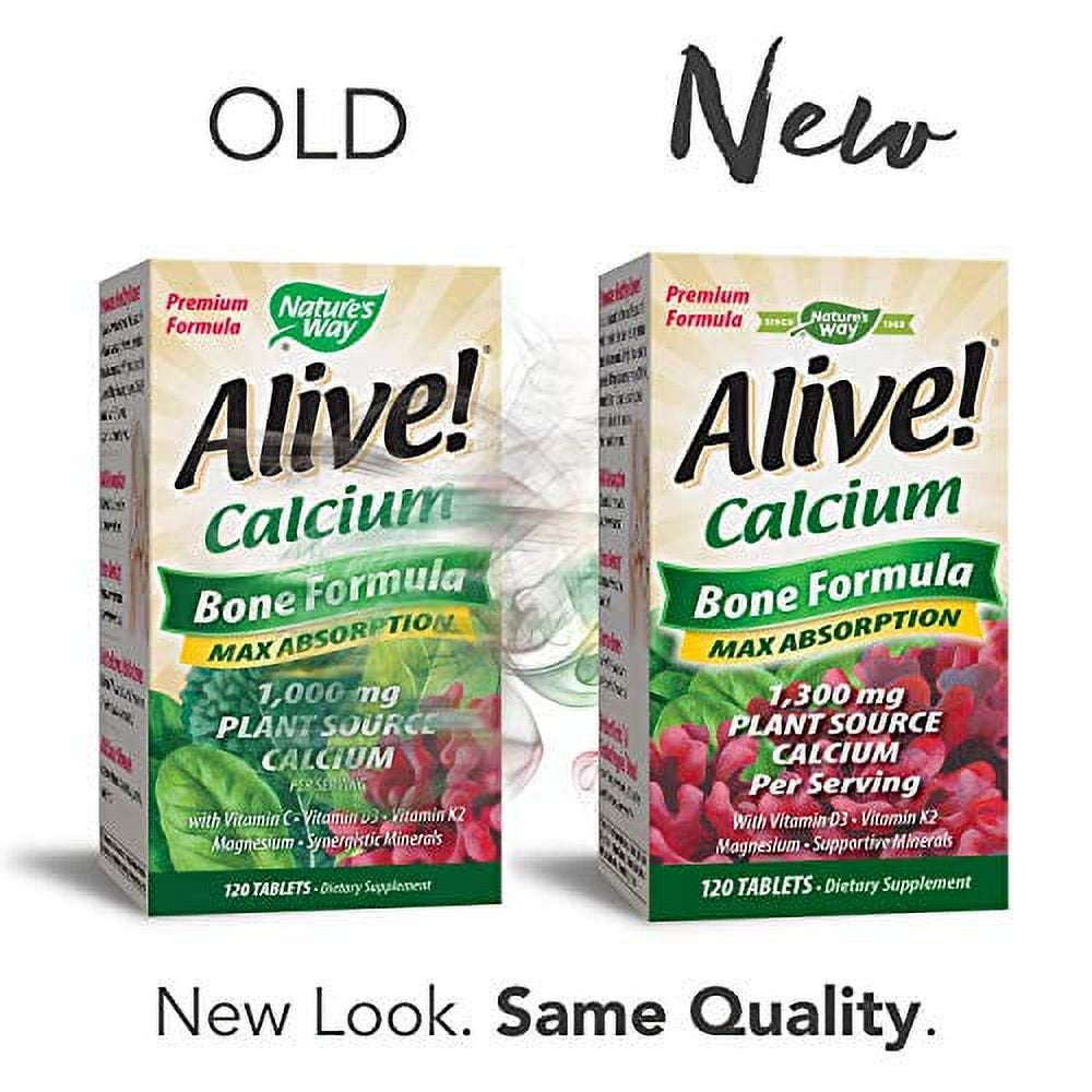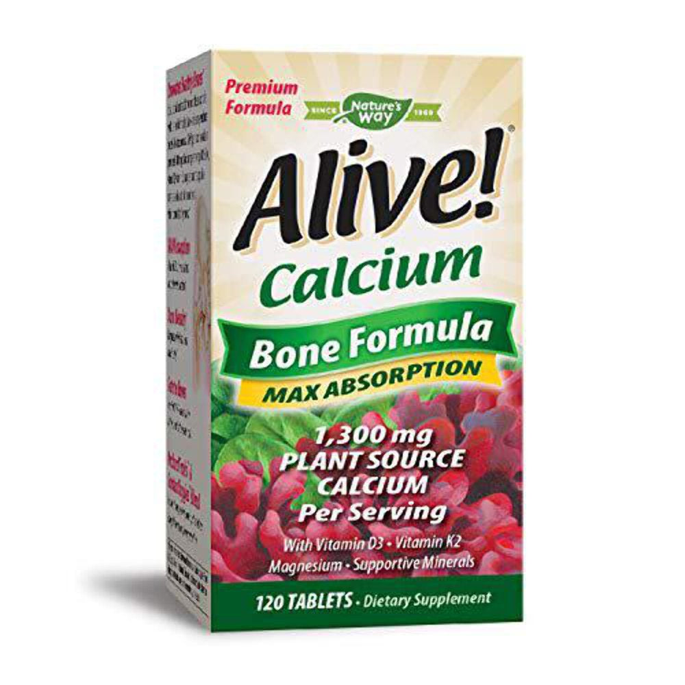 Nature's Way Alive! Calcium Bone Formula Supplement (1300 mg per serving), 120 Tablets CALCIUM SUPPLEMENT: This Alive! calcium supplement contains vitamin C, D3 and K2 along with calcium, magnesium and more | PLANT SOURCE CALCIUM: Derived from Lithothamnion, kale, spinach and collard greens | MORE THAN JUST CALCIUM: Enhance calcium absorption with vitamin D3 (2, 000 IU per serving) | ALL OF THE GOOD. NONE OF THE BAD: Gluten free. Contains NO artificial flavoring, dairy products, preservatives, wheat or yeast | SERVING SIZE: Take 4 tablets daily; Includes a 30 day supply. These statements have not been evaluated by the Food & Drug Administration. This product is not intended to diagnose, treat, cure or prevent any disease Alive! Plant Source Calcium is derived from Lithothamnion (calcified red algae seaweed sustainably harvested from pristine Icelandic waters). Easy to digest & utilize. While many calcium supplements are sourced from limestone rock or animal bones, Alive! Calcium provides Aquamin calcium that may be easier for the body to digest, absorb, and utilize. Promotes Healthy Bones.* Adequate calcium intake throughout life, as part of a well-balanced diet and regular exercise, may reduce the risk of osteoporosis. Alive! Plant Source Calcium provides 1,300 mg of calcium per serving (100% DV), vitamin D3, vitamin K2, magnesium and supportive materials, such as strontium and boron, which promote healthy bones.* Max Absorption: Vitamin D3 enhances calcium absorption and utilization.* Bone Density: Magnesium helps maintain bone density.* Vitamin K2 (MK-7) directs calcium to the bones where it's needed most.*