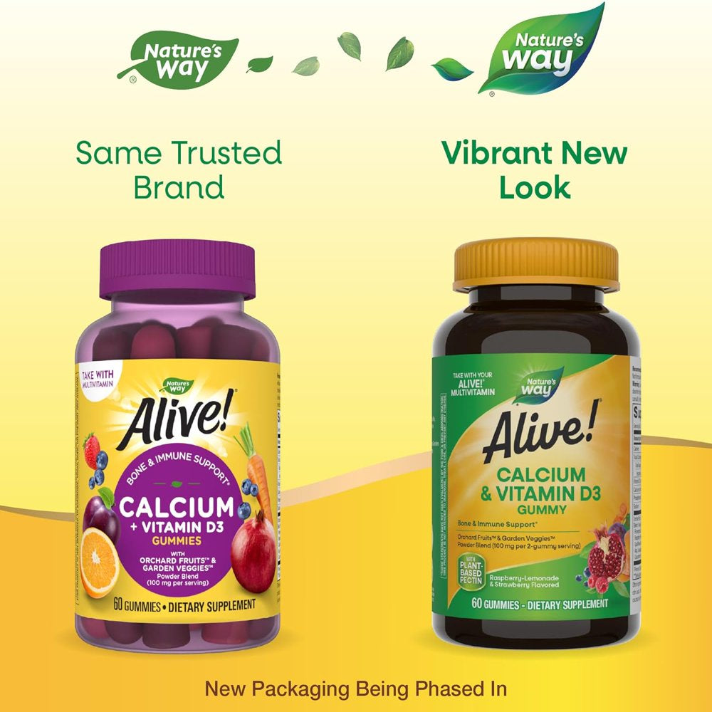 Nature'S Way Alive! Premium Calcium + D3 Gummies, Supports Healthy Bones & Muscles*, Strawberry and Raspberry Lemonade Flavored, 60 Gummies