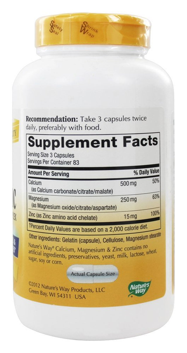 Nature's Way - Calcium, Magnesium, & Zinc - 250 Capsules Nature's Way Calcium, Magnesium, & Zinc is a dietary supplement to help promote strong bones and immunity. The calcium and magnesium in this particular Nature's Way product do their job strengthening the muscles and bones. Zinc, on the other hand, promotes healthy cell division which is important for proper growth. Calcium is well known because it maintains skeletal health (teeth, bones).