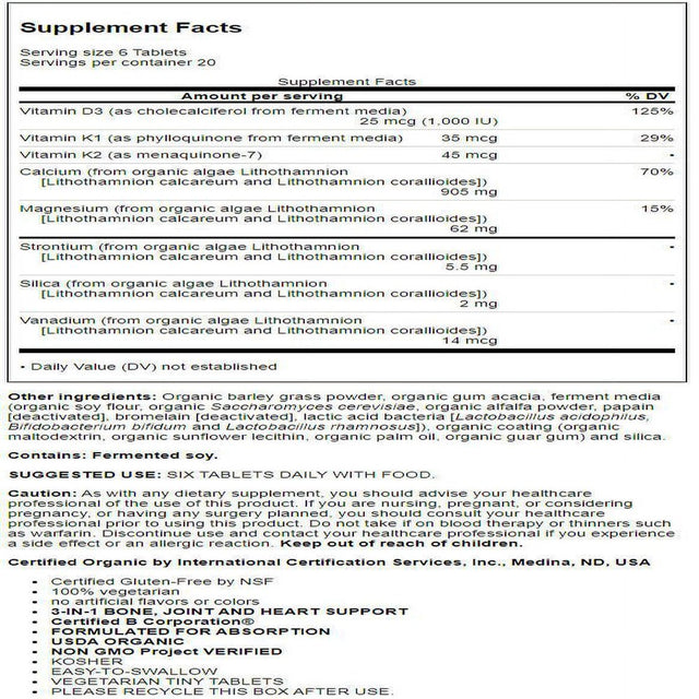- Features plant calcium, vitamin D3, vitamin K2, magnesium and 70+ minerals