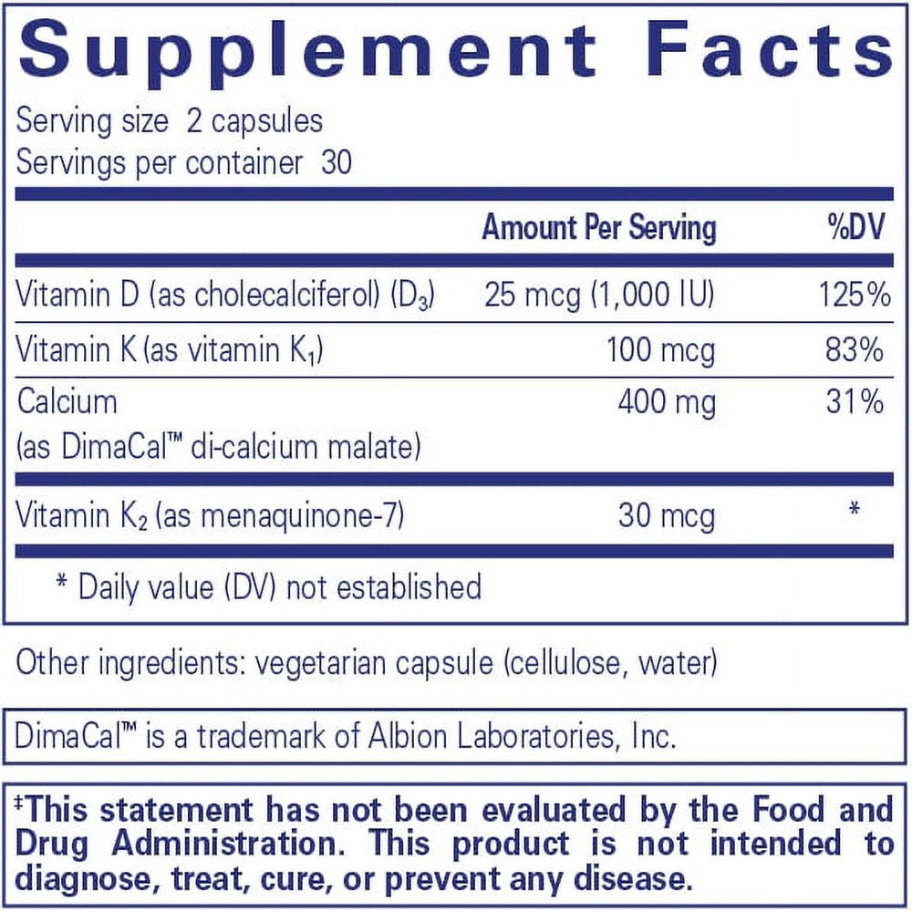 Each serving size (2 capsules) contains: Vitamin D (as cholecalciferol) 25 mcg, Vitamin K (as vitamin K1) 100 mcg, Calcium (as DimaCal di-calcium malate) 400 mg, Vitamin K2 (as menaquinone-7) 30 mcg. Other ingredients: vegetarian capsule (cellulose, water)./div>