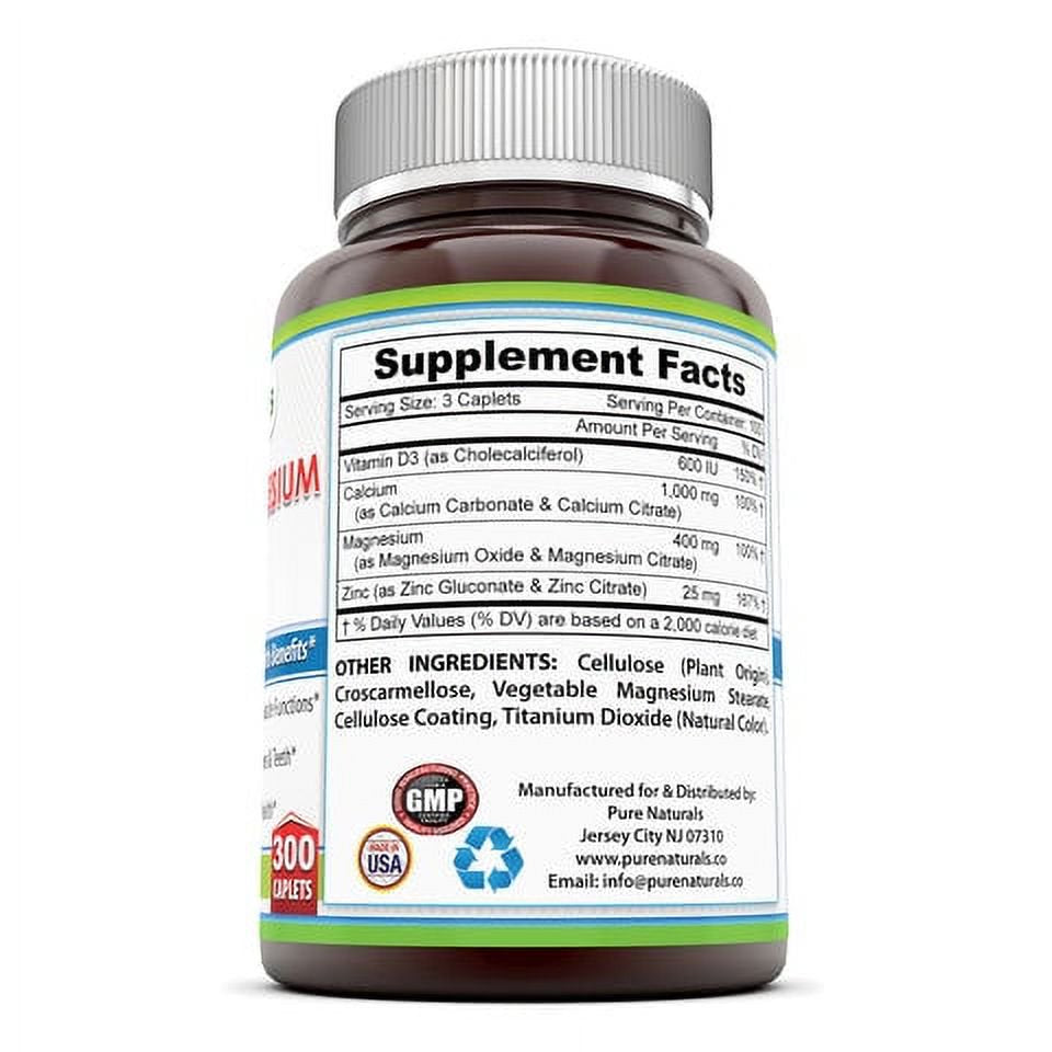 Pure Naturals Calcium Magnesium Zinc D3 | 300 Tablets Supplement | Calcium 1000Mg, Magnesium 400Mg, Zinc 25Mg, Vitamin D3 600 IU | Non-Gmo | Gluten Free | Made in USA