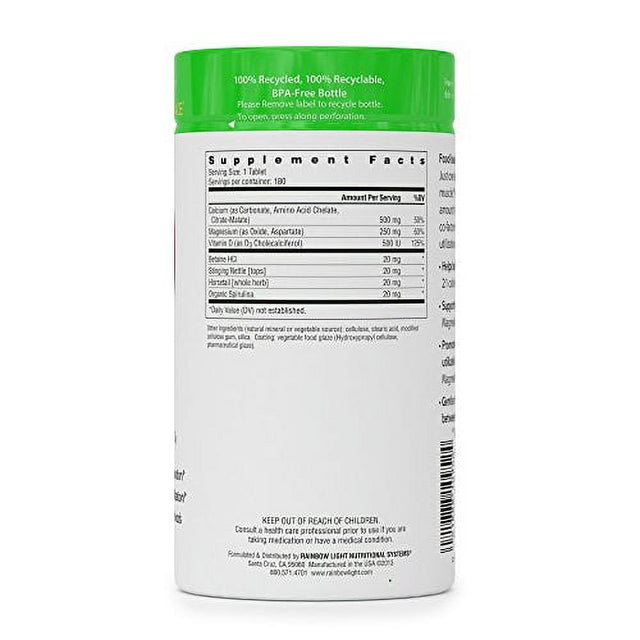 Rainbow Light Food-Based Calcium provides the added bone density support you need every day in just one tablet. Formulated with a two-to-one ratio of 500 milligrams of calcium to 250 milligrams of magnesium, this formula also contains mineral rich stinging nettle, horsetail, and organic spirulina to support bones, relax muscles, and help with digestion and utilization. Food-Based Calcium is safe and easy on the stomach. When taken as directed, it can help support bone health. Food-Based Calcium provides 500 milligrams of calcium to help build and strengthen bones and teeth, plus 250 milligrams of magnesium and 500 IU of vitamin D3 to promote enhanced calcium absorption and utilization. Additionally, vitamin D3 and magnesium support muscle relaxation and bone flexibility.