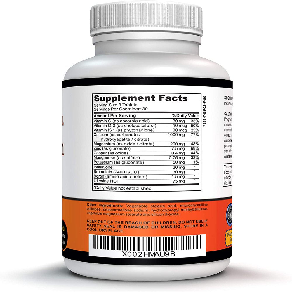 Bones are always breaking down and rebuilding, and Calcium is needed for this process. Taking extra Calcium helps bone support and supplements poor diets.Vitamin C is important for healthy bones. Ascorbic Acid is essential to the formation of collagen, the cornerstone that bone mineralization is built on. Studies have associated increased Vitamin C levels with greater bone density.Vitamin K is important to normal bone growth and development. Phytonadione helps attract Calcium Citrate to the bone. Low blood levels of Vitamin K are associated with lower bone density and possibly increased fracture risk.Vitamin D has many important jobs in your body. It keeps your bones strong by helping your body absorb Magnesium and Calcium supplements, key minerals for bone supplements. Boron could help enhance bone health for men by increasing how long Cholecalciferol works in your body.Proper Calcium absorption also depends on Zinc, and a deficiency prevents full absorption of Calcium pills. L-Lysine increases Calcium Carbonate absorption and drastically decreases its excretion.Manganese and Copper are essential trace minerals that have been found to play an important role in bone vitamins for women.The role of Potassium in bone health relates to the ability of Potassium Gluconate to neutralize bone-depleting metabolic acids. These acids eat away and use the bone up.Taking Ipriflavone in combination with 1000 mg of Calcium daily can prevent loss of bone mineral density with osteoporosis or low bone strength.Bromelain can help to reduce pain, swelling and bruising along with improve healing broken bones in bone growth supplements.