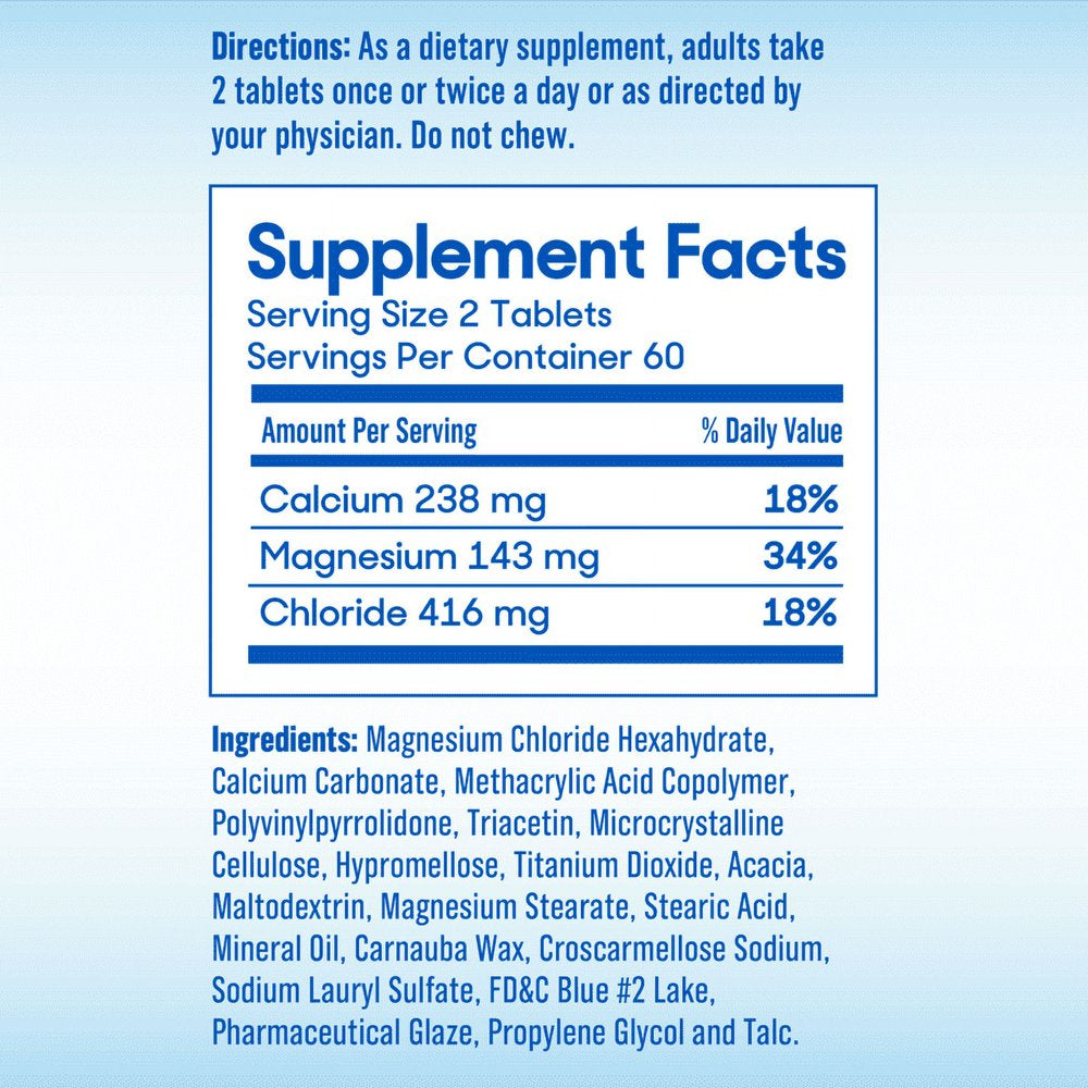 Magnesium Chloride, Calcium Carbonate, Polyvinylpyrrolidone, Microcrystalline Cellulose, Methacrylic Acid Copolymer, Hypromellose, Acacia, Maldodextrin, Talc, Titanium Dioxide, Triacetin, Stearic Acid, Magnesium Stearate, Mineral Oil, Croscarmellose Sodium, Sodium Lauryl Sulfate, Carnauba Wax, FD&C Blue #2 Aluminum Lake, Pharmaceutical Glaze and Propylene Glycol./div>