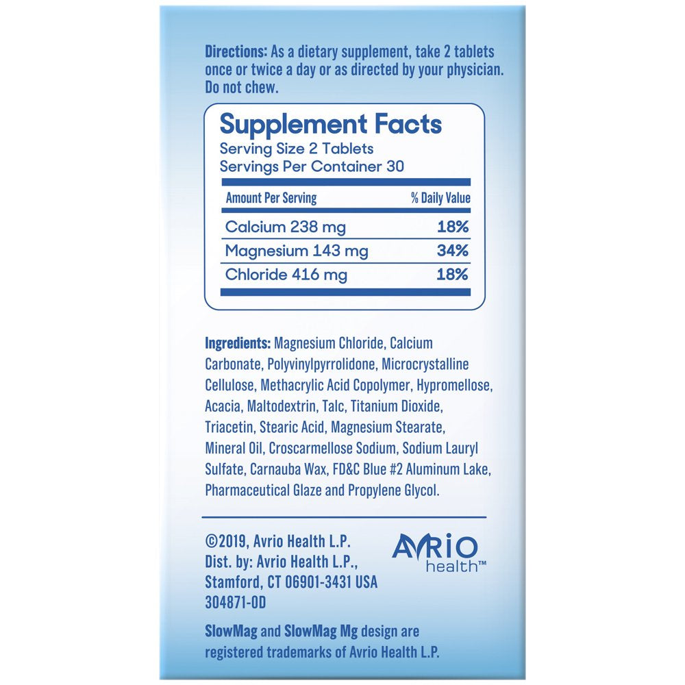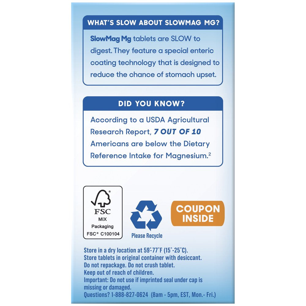 More of the Magnesium You Need SlowMag® Mg Muscle + Heart magnesium chloride dietary supplement is one of the best ways to get the magnesium you need to support: • Proper Muscle Function* • Energy Metabolism* • Cardiovascular Health* Why is it Called SlowMag? SlowMag® Mg Muscle + Heart magnesium chloride + calcium tablets have a special enteric coating that allows them to pass through the gastric juices of the stomach, making them SLOOOOOW to digest. This reduces the chance of an upset stomach caused by some magnesium supplements. And SlowMag® Mg tablets are specially formulated to maximize absorption as well as be easy on the stomach. SlowMag® Mg Muscle + Heart is a Specially Formulated Magnesium Supplement: • Magnesium chloride for increased absorption versus magnesium oxide (1) • Magnesium chloride + calcium for normal nerve and muscle function* • Enteric-coated tablets to help reduce the chance of stomach upset *These statements have not been evaluated by the Food and Drug Administration. These products are not intended to diagnose, treat, cure, or prevent any disease. 1. Firoz M, Graber M. Bioavailability of US commercial magnesium preparations. Magnesium Research. 2001;14(4):257-262. 2. USDA Agricultural Research Service. Continuing Survey of Food Intakes by Individuals (CSFII) 1994-96, 1998.
