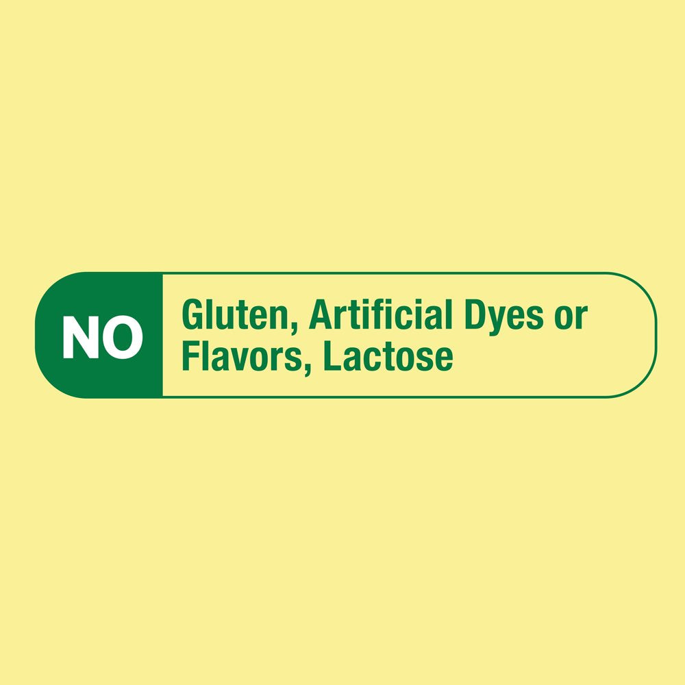 - No gluten, lactose, artificial dyes, or artificial flavors