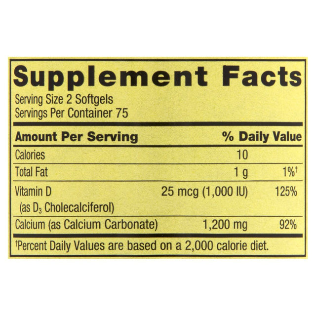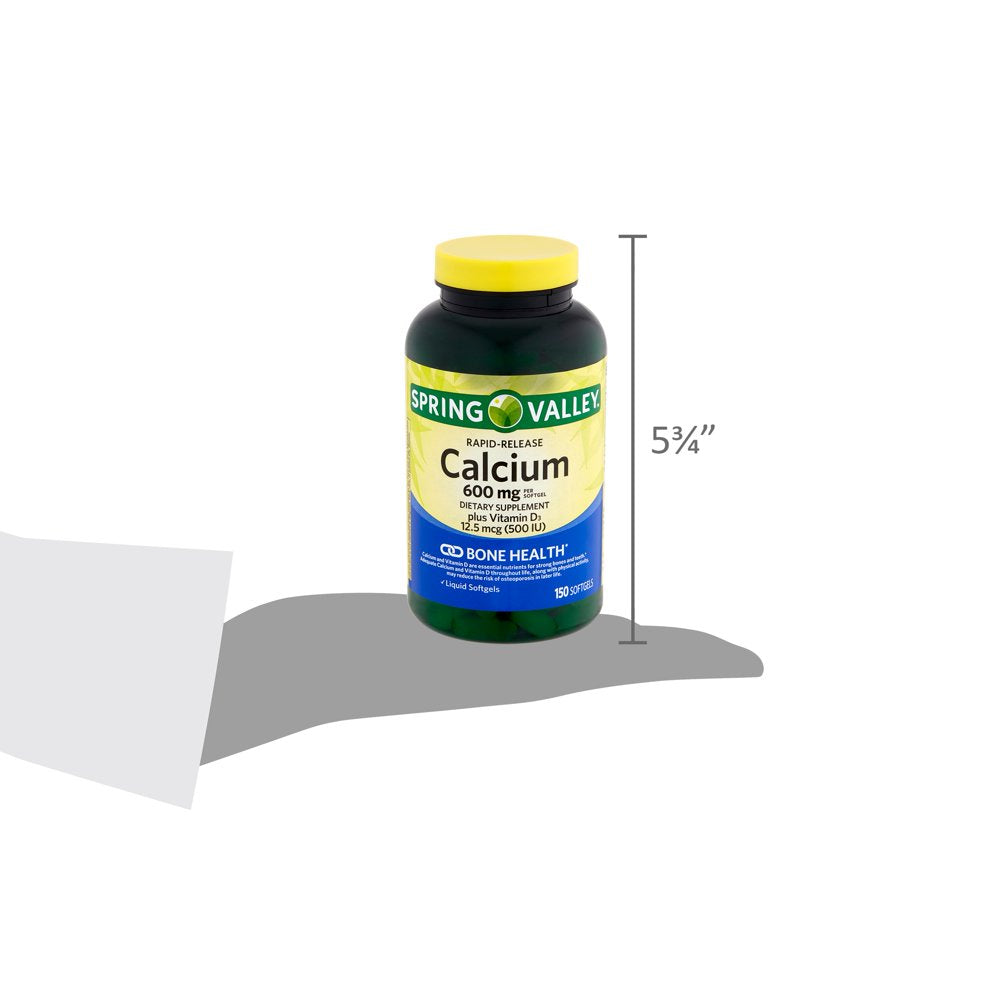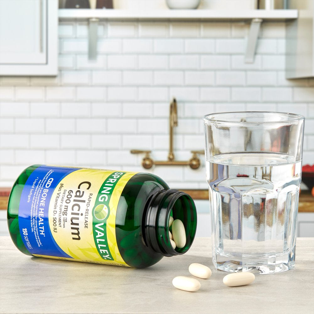 Features Supports bone health, Dietary supplement, Bottle of 150 rapid release liquid softgels, 600mg of calcium plus 500IU of vitamin D-3 per softgel, No gluten, preservatives, or artificial flavor, Tamper-evident bottle