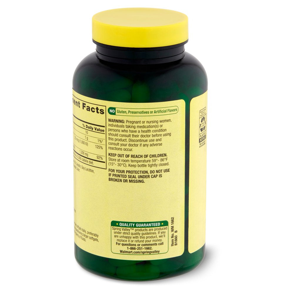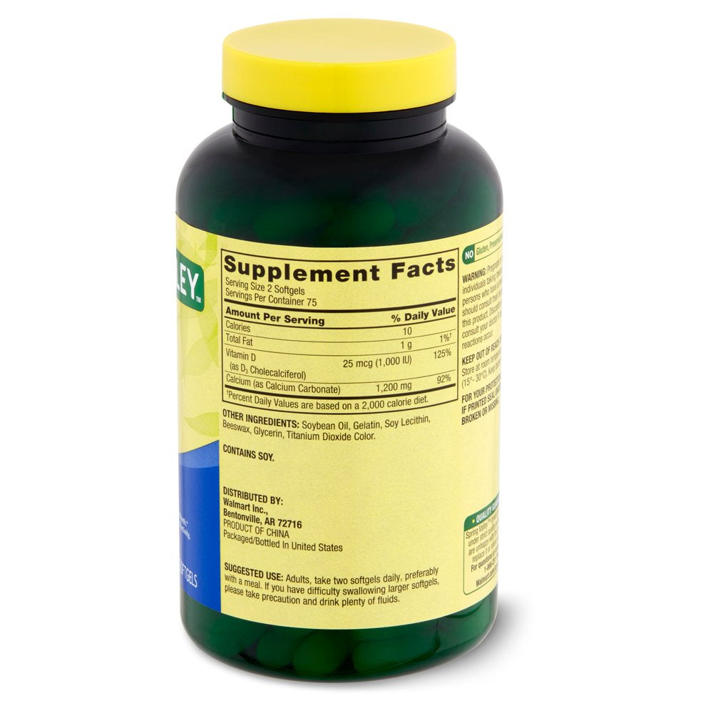Spring Valley Rapid-Release Calcium Dietary Supplement, 600 mg is a dietary supplement that promotes bone health. Calcium and vitamin D are essential nutrients for strong bones and teeth. Adequate calcium and vitamin D throughout life, along with physical activity, may reduce the risk of osteoporosis in later life. Each two-softgel serving provides 1200 milligrams of calcium and 1000IU of vitamin D-3. These rapid-release liquid softgels are free of gluten, preservatives, and artificial flavors. The suggested adult dosage is two softgels daily, preferably with a meal. You can rest assured Spring Valley Rapid-Release Calcium Dietary Supplements, 600 mg are produced with strict quality guidelines and backed by our quality guarantee.