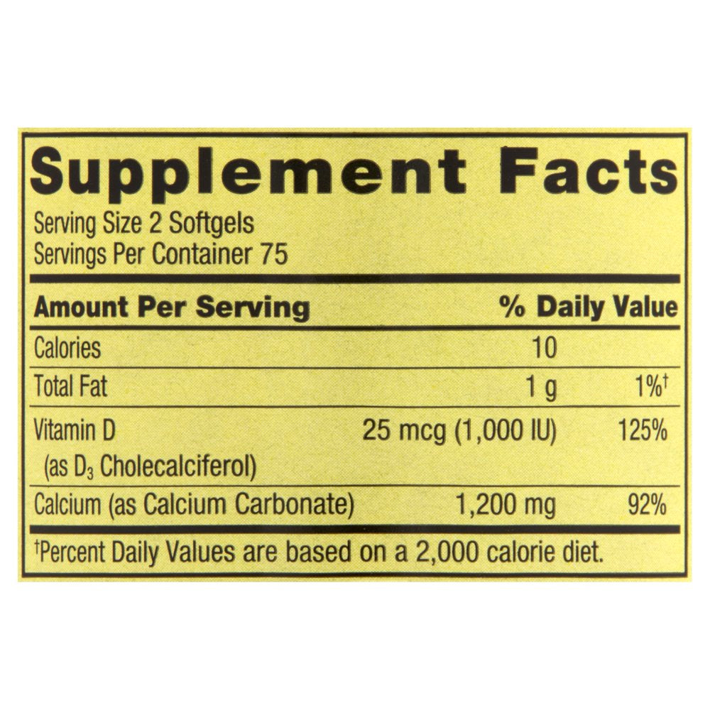 Serving Size 2 Sofgels. Servings Per Container 75. 10 Calories, 10 Fat Calories, 1 G Total Fat, 200 Iu Vitamin D (As Cholecalciferol), 1.2 G (1,200 Mg) Calcium (As Calcium Carbonate). Other: Soybean Oil, Gelatin, Glycerin, Soy Lecithin, Titanium Dioxide Color./div>