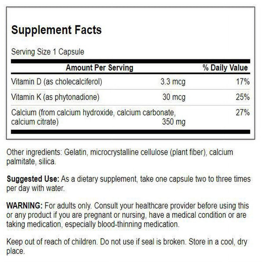 An outstanding source of essential nutrients for bone maintenance, Swanson Calcium with Vitamins D & K provides quality nutrition at an affordable price. Designed to give your bones the nutrients they need to keep them healthy and strong, Calcium with Vitamins D & K is a comprehensive formula combining three forms of calcium with the synergistic support of vitamins D and K. Each convenient capsule contains 350 mg of calcium from calcium hydroxide, calcium carbonate and calcium citrate--plus 30 mcg of vitamin K and 3.3 mcg (133 IU) of vitamin D.