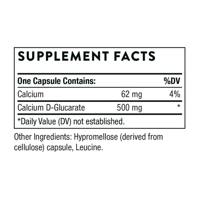 One Capsule Contains: Calcium 62 mg. Calcium D-Glucarate 500 mg. Other Ingredients: Hypromellose (derived from cellulose) capsule, Silicon Dioxide./div>