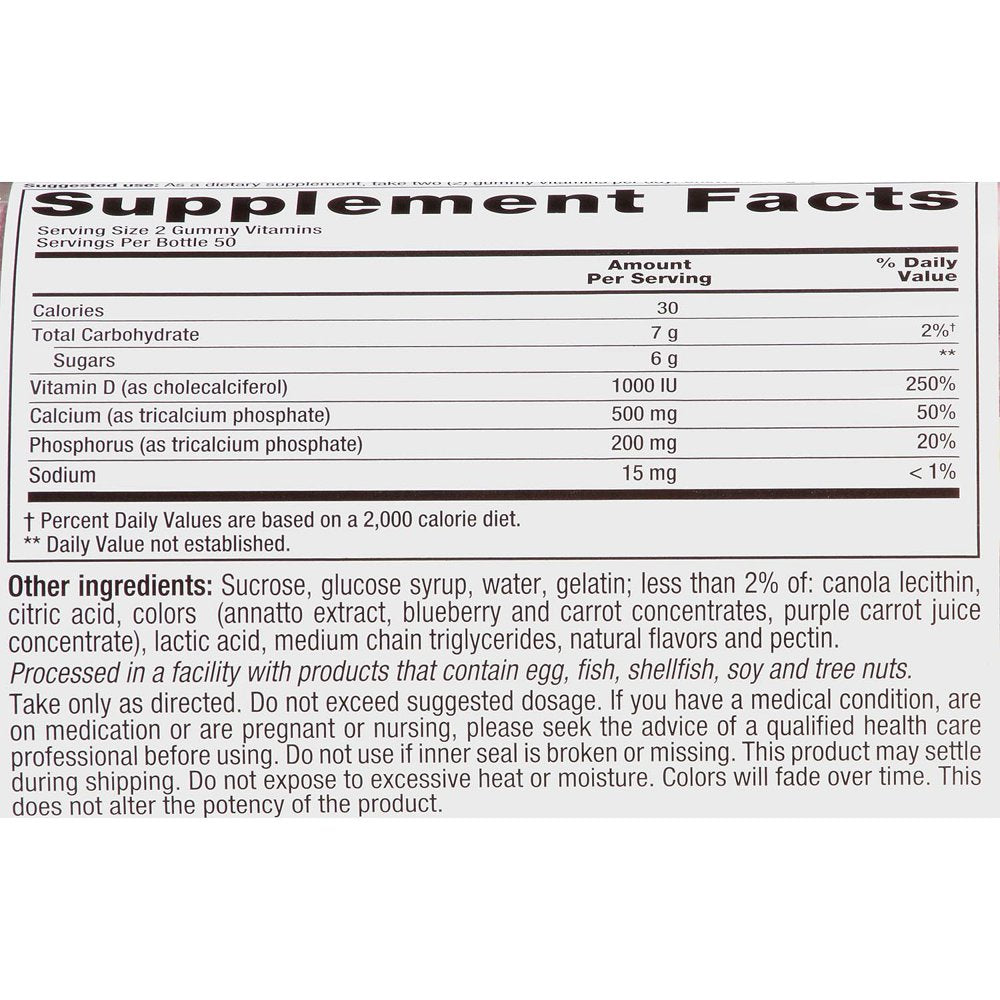 DescriptionIndulge in a delicious calcium treat! A fusion of essential nutrients and natural fruit and cream flavors, two vitafusion Calcium gummies provide an excellent source of calcium and vitamin D. Each serving supports bone health with 500 mg of calcium and 1,000 IU of Vitamin D.SpecificationsHandy twin pack, 100 gummies eachVitamin D3 1,000 IUAn excellent source of calcium plus high-potency vitamin D3Bone supportAmerica's #1 gummy vitamin brandNatural fruit and cream flavorsGluten-freevitafusion Calcium Gummies, 500 mg (200 ct.)