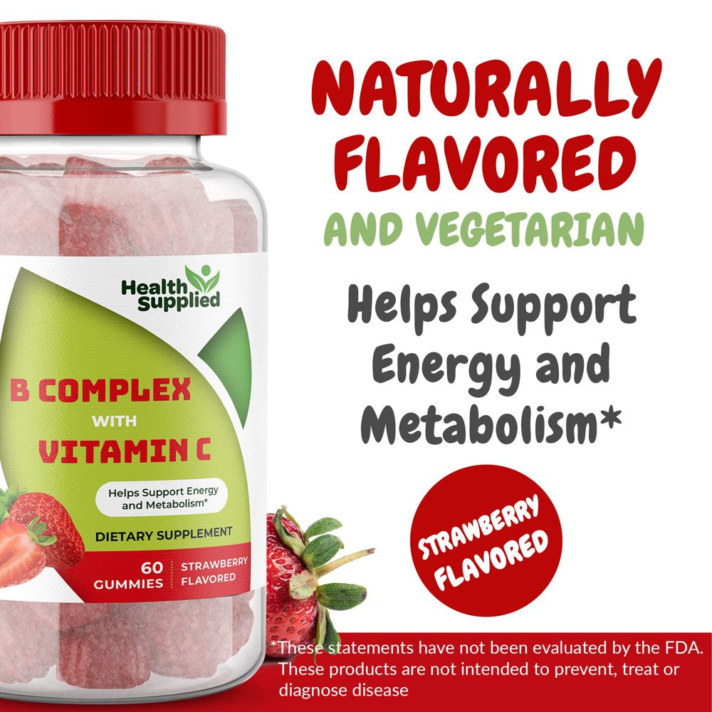Vitamin B Complex with Vitamin C Gummies | Vitamin B6, Vitamin B12, Niacinamide, Folic Acid, Biotin and Calcium | Great Tasting Natural Strawberry Flavor Gummy Daily Supplement