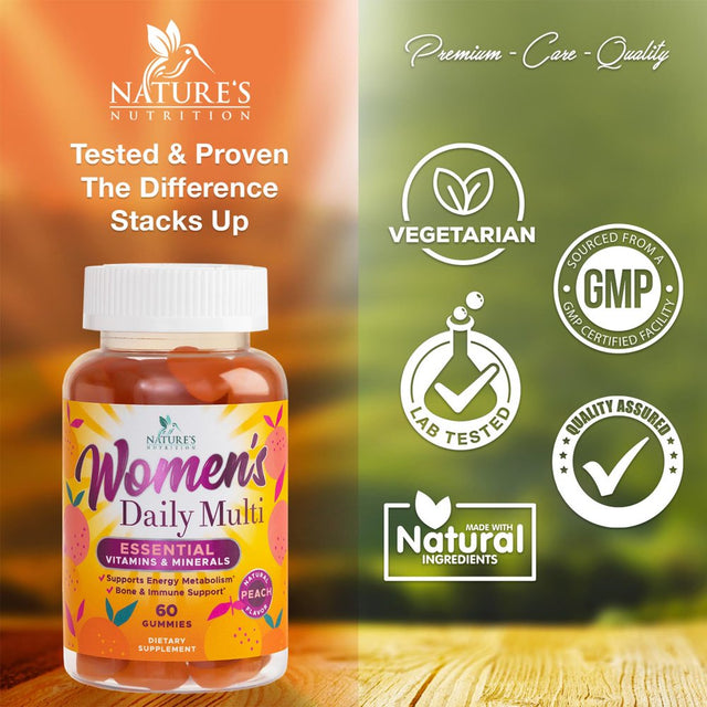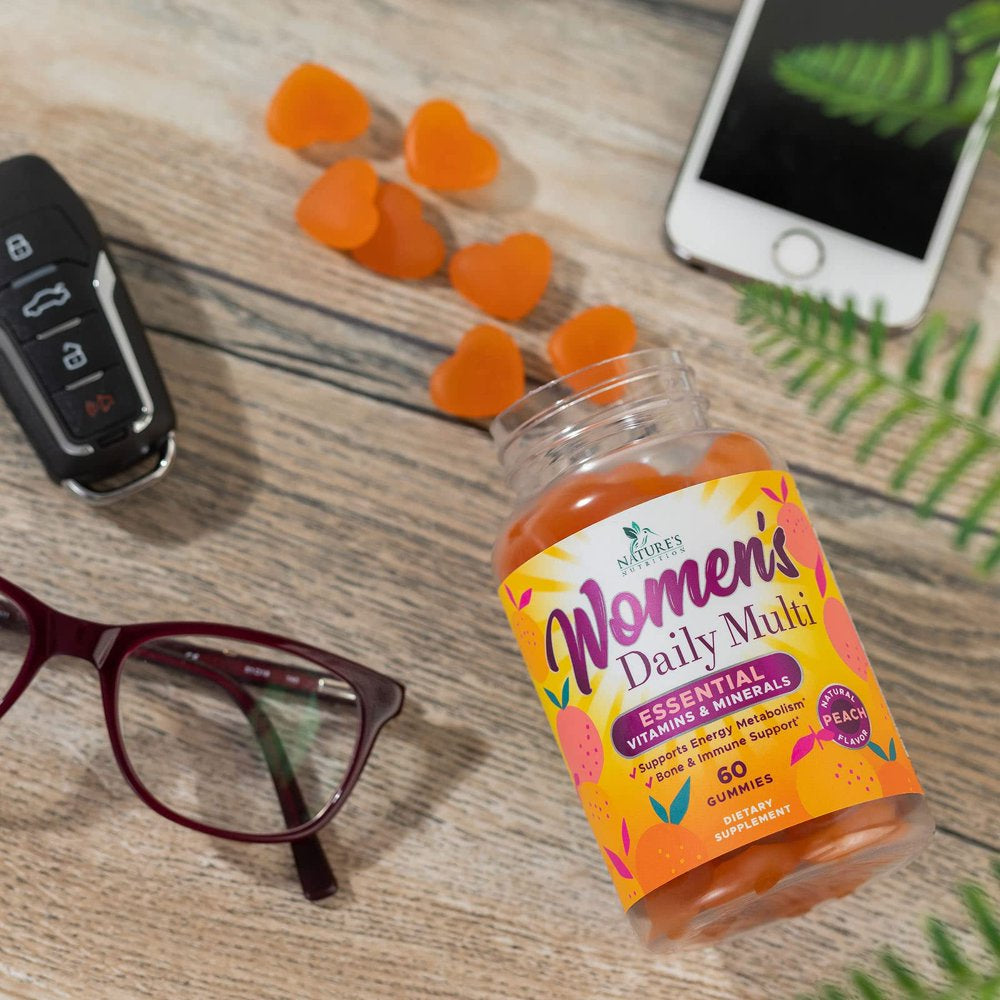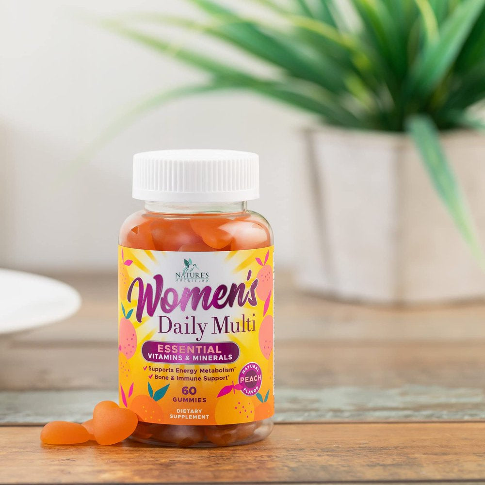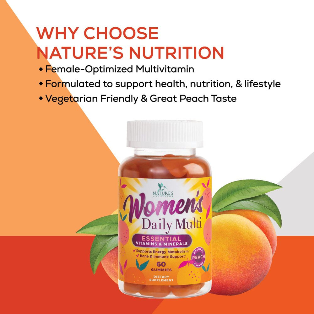Nature's Nutrition Gummies Targeted Nutrition for Women We use a powerful and complete blend of premium vitamins and essential minerals specifically formulated for women's overall health. When your meals are less than stellar, our gummies are a great supplement to your daily routine. What Makes the DifferencePremium Ingredients: Our powerful formulas deliver high-quality vitamins and essential minerals in forms that the body prefers and can easily use. Get what your body craves in 1 yummy serving.Taste: We use natural, peach flavor to make our gummies taste so good you won't want to stop eating them. Only the Best: Put only the best into your body and you will get the best out of it. We use the best ingredients so you don't have to worry.Did You Know Our Nutritional Gummies Contain: As much Vitamin A as a Cup of BroccoliAs much Vita C as 1 TangerineAs much Vitamin D as 5 oz of SalmonAll packed into a delicious peach gummy specifically formulated for women's health.