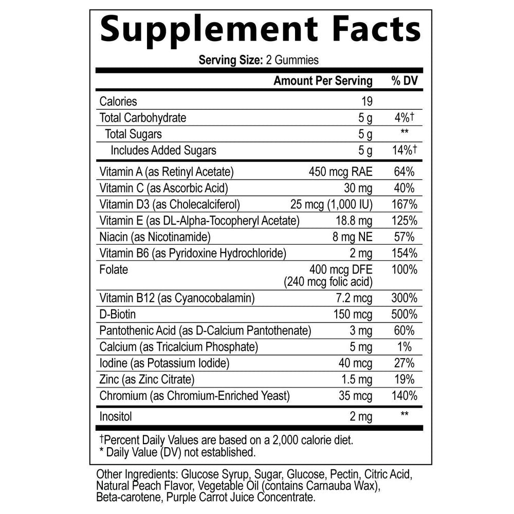 Vitamin A (as Retinyl Acetate), Vitamin C (as Ascorbic Acid), Vitamin D3 (as Cholecalciferol), Vitamin E (as DL-Alpha-Tocopheryl Acetate), Niacin (as Nicotinamide), Vitamin B6 (as Pyridoxine Hydrochloride), Folic Acid, Vitamin B12 (as Cyanocobalamin), D-Biotin, Pantothenic Acid, Calcium (as Tricalcium Phosphate), Iodine (as Potassium Iodide), Zinc (as Zinc Citrate), Chromium (as Chromium-Enriched Yeast), Inositol Other Ingredients: Glucose Syrup, Sugar, Glucose, Pectin, Citric Acid, Sodium Citrate, Natural Peach Flaor, Vegetable Oil, Beta-Carotene, Purple Carrot Juice Concentrate/div>