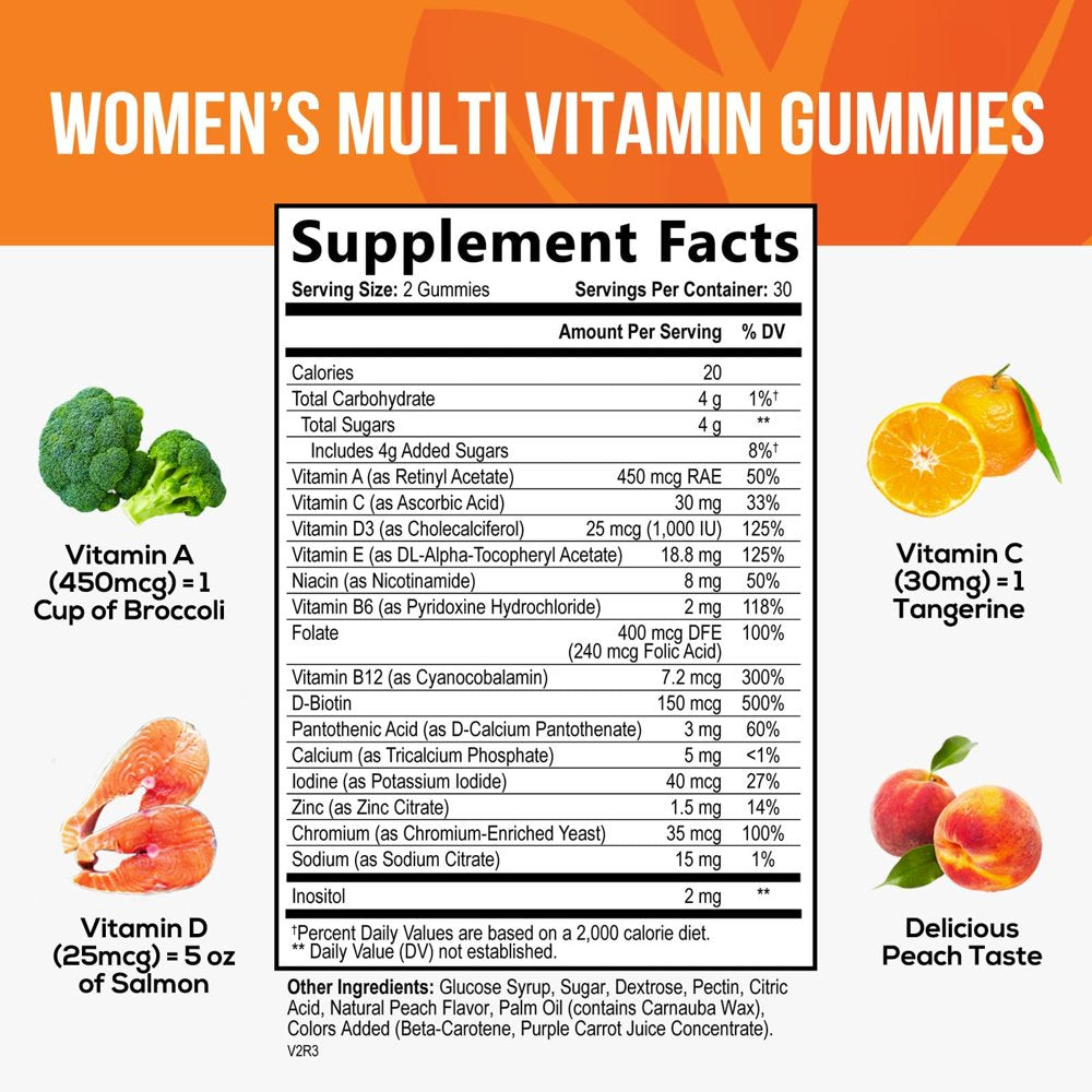Womens Multivitamin Gummies, Daily Multi Vitamin Gummy for Women with Vitamins A, C, D, E, B-6, B-12, Biotin, Folic Acid, Calcium, & Zinc, Nature'S Immune Health Support, Peach Flavored - 60 Gummies