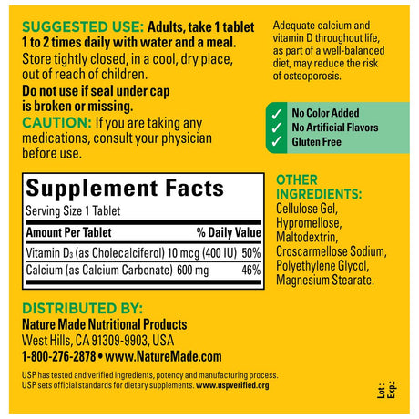 Nature Made Calcium 600 Mg with Vitamin D3 Tablets, Dietary Supplement, 220 Count