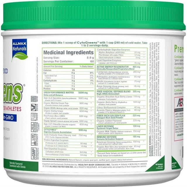 - Eat Clean, Be Strong With ALLMAX Super Greens: Cytogreens greens powder contains our exclusive nutrient-rich, Green Performance Matrix to enhance performance, recovery and help the body recycle energy more efficiently while exercising. Better still, you get the dark greens and color-rich, anti-oxidant berry nutrients your body needs!